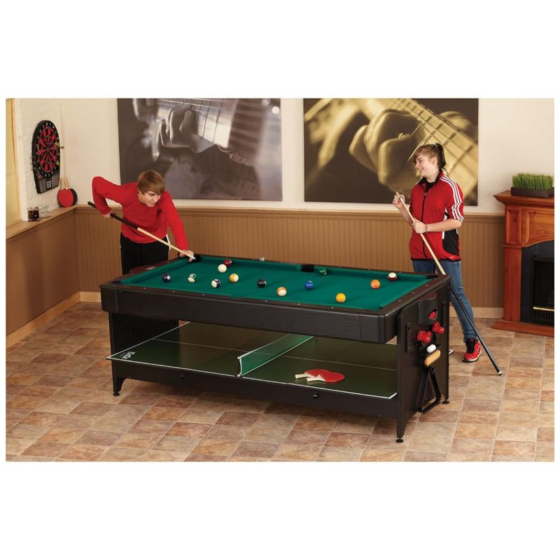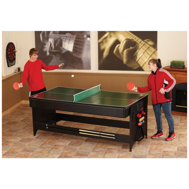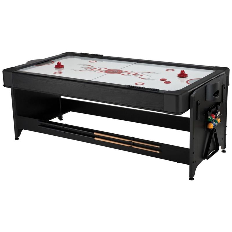 Esta mesa de jogos combina três opções populares em um único espaço compacto, ideal para diversão em família e com amigos. Ela oferece bilhar completo, incluindo tacos de sinuca e bolas para uma experiência autêntica. Além disso, transforma-se facilmente em uma mesa de Air Hockey, equipada com discos de hóquei e empurradores para partidas dinâmicas e emocionantes. Para aqueles que preferem um jogo de pingue-pongue, a mesa converte-se rapidamente com raquetes e uma rede inclusas.