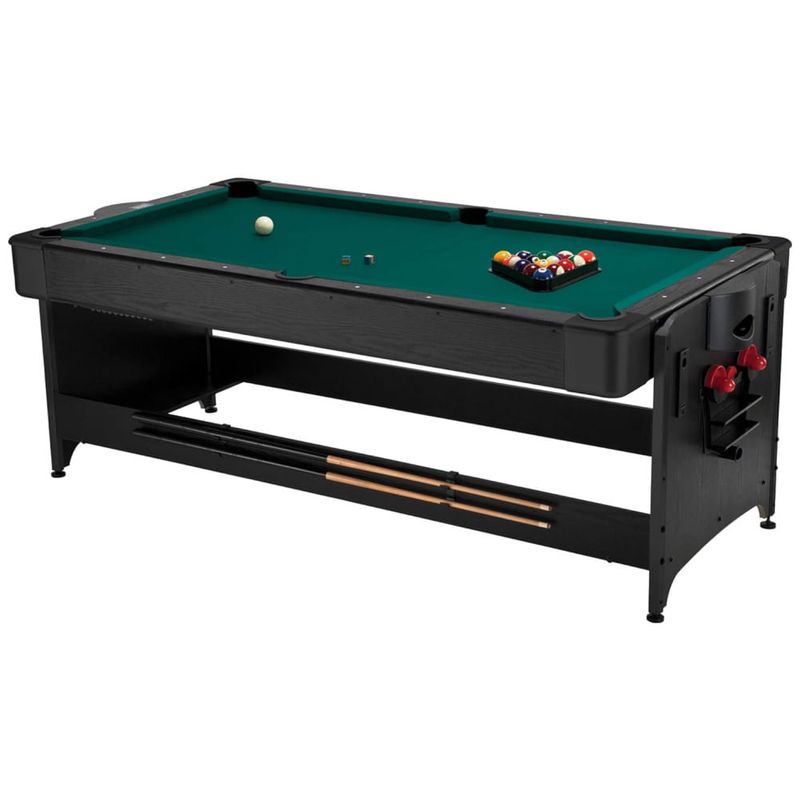 Componentes Incluídos: Mesa Pockey Flip, Conjunto de bolas de bilhar de 5 cm, um triângulo de resina, dois tacos de 144 cm, dois pedaços de giz, uma escova de bilhar, quatro empurradores e discos de Air-Hockey, duas raquetes e bolas de tênis de mesa