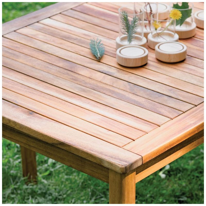 A estrutura é produzida em madeira maciça de acácia, naturalmente resistente às intempéries, projetada para suportar exposição ao sol, chuva e umidade ao longo do ano, desde que sejam seguidas as rotinas de manutenção indicadas para móveis externos. O tampo e a base com pés retos garantem estabilidade em superfícies planas e permitem combinar a mesa com bancos, banquetas ou cadeiras da linha Acadia (vendidos separadamente), compondo layouts flexíveis de mobiliário para crianças.?