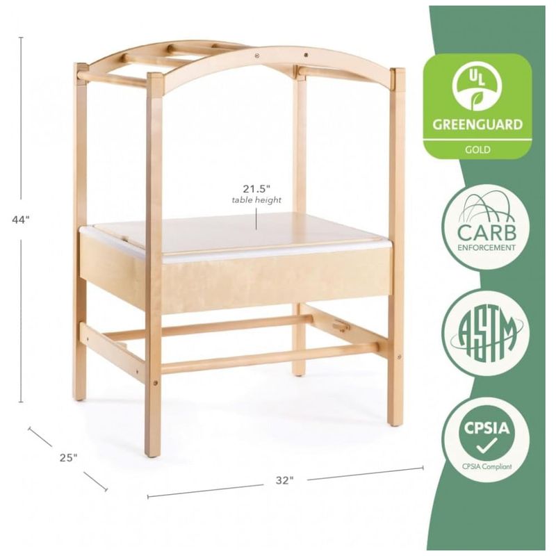 A estrutura é feita em madeira de bétula maciça e compensado de bétula com certificação Greenguard Gold, recebendo acabamento resistente à água para uso em atividades molhadas e secas, devendo ser armazenada em ambiente interno após o uso. A mesa completa com arco mede cerca de 81cm de largura, 63,5cm de profundidade e 111cm de altura, com tampo a aproximadamente 55cm do piso, adequada à altura de crianças pequenas em pé; a cuba plástica removível inclui dreno para facilitar escoamento e limpeza após as atividades.?