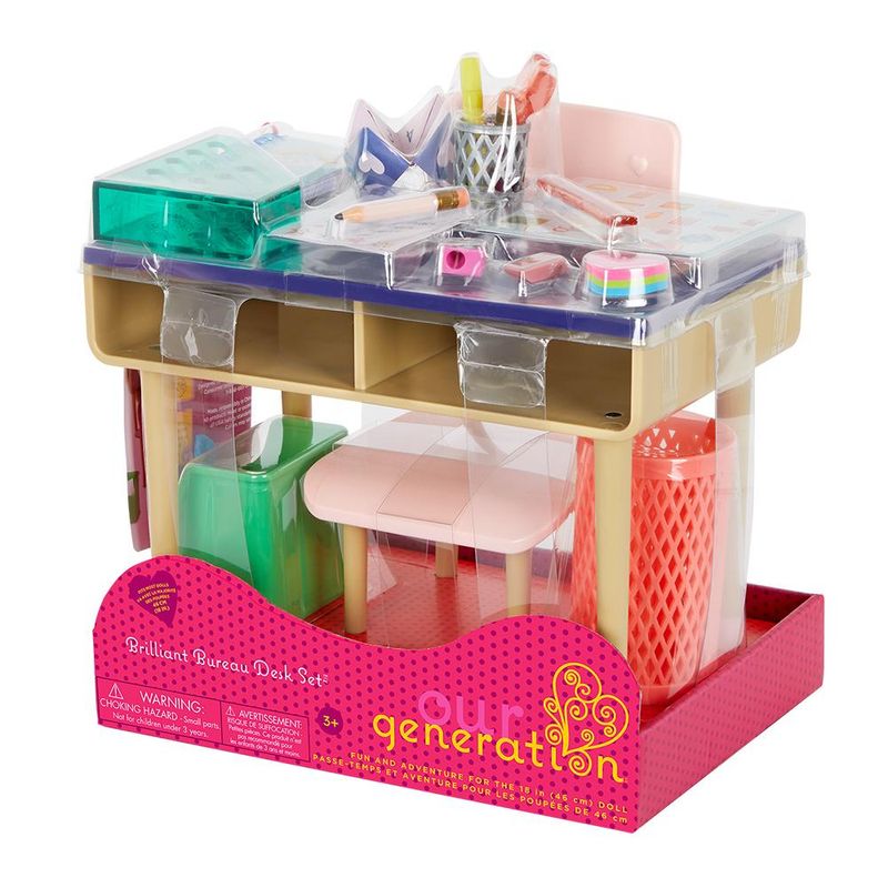 Um espaço criativo para suas melhores ideias! Suas bonecas de 46cm vão adorar sentar em sua mesa para escrever e desenhar com este conjunto Our Generation! Este acessório de mesa é durável, resistente e tem detalhes realistas que o tornam ainda mais divertido! Use o porta-lápis para organizar os lápis, régua e tesoura; a tampa do marcador até se abre para que suas bonecas possam fingir que estão destacando informações importantes! Complete a lista de verificação depois da escola e decore seu caderno com adesivos incríveis da folha de adesivos. Acessórios faz de conta. Bonecas vendidas separadamente. Our Generation não se trata apenas de uma boneca, um lindo conjunto de roupas ou mesmo um kit de acessórios fantásticos. É sobre incentivar crianças de todos os estilos e gostos a criar suas próprias histórias, desenvolvendo um universo ilimitado de brincadeiras com bonecas e acessórios. Sua embalagem é feita de material reciclado, especialmente desenvolvida para uma geração mais ecológica que não aceitaria nada menos. Essa é a nossa história, e essa é a nossa turma!