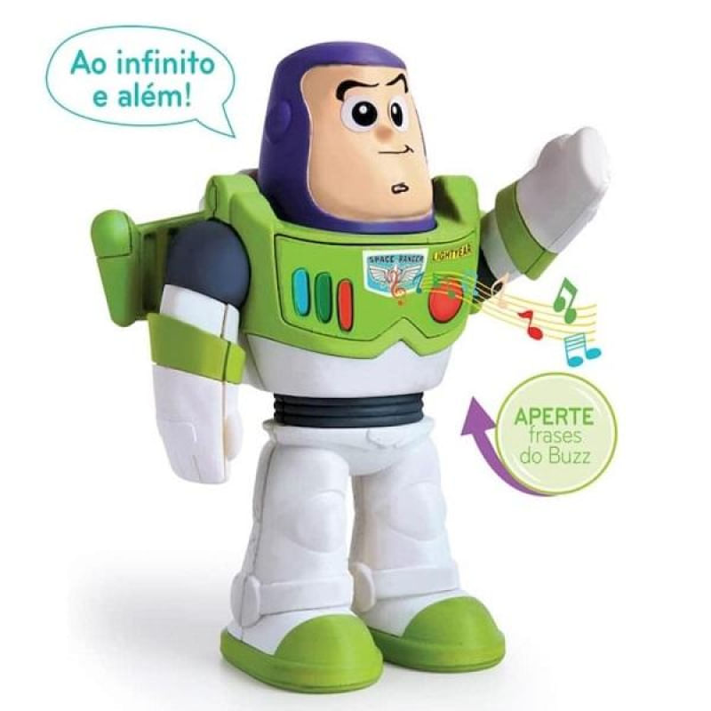 Buzz Lightyer, o queridinho das crianças, vem em missão de paz para seu amigão, te divertir e acompanhar em muitas aventuras. Este incrível boneco, tem braços articulados, e cintura com crec crec. Apertando o botão ele fala frases como as do filme Toy Story!
