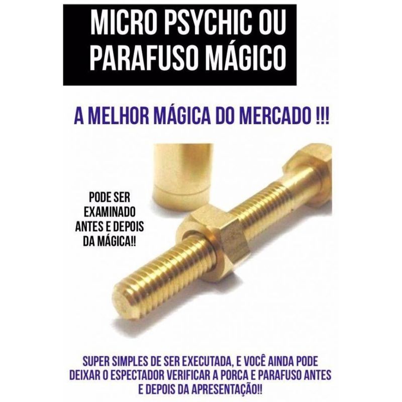 Micro Psychic - Parafuso Mentalista O magico mostra um parafuso e porca. Pede para alguém colocar a porca no parafuso. O magico (sem manga comprida, até mesmo sem camisa, mostra claramente as mãos vazias, e toma o parafuso na mão. A porca começa a girar e cai na mão do espectador. Só poderia ser tecnologia japonesa mesmo. Fantástico. Pode ser examinado antes e depois. Pode também ser colocado dentro de um copo de vidro, na mão do espectador, sem a presença do mágico, e a porca gira e sai do parafuso. Veja o vídeo. Especificações Técnicas: - Nível Fácil - Precisa colocar bateria AAA não fornecida Item Incluso: - 1 Parafuso Gimmick; - 1 ima
