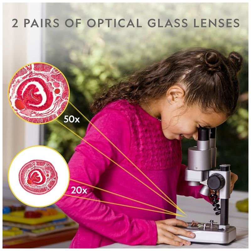 PODEROSA FERRAMENTA DE APRENDIZADO Este microscópio possui dois conjuntos de lentes de vidro óptico que fornecem ampliação de 20x e 50x e é fácil de operar, tornando o aprendizado divertido e acessível para jovens cientistas. Experimentos científicos infantis nunca foram tão divertidos