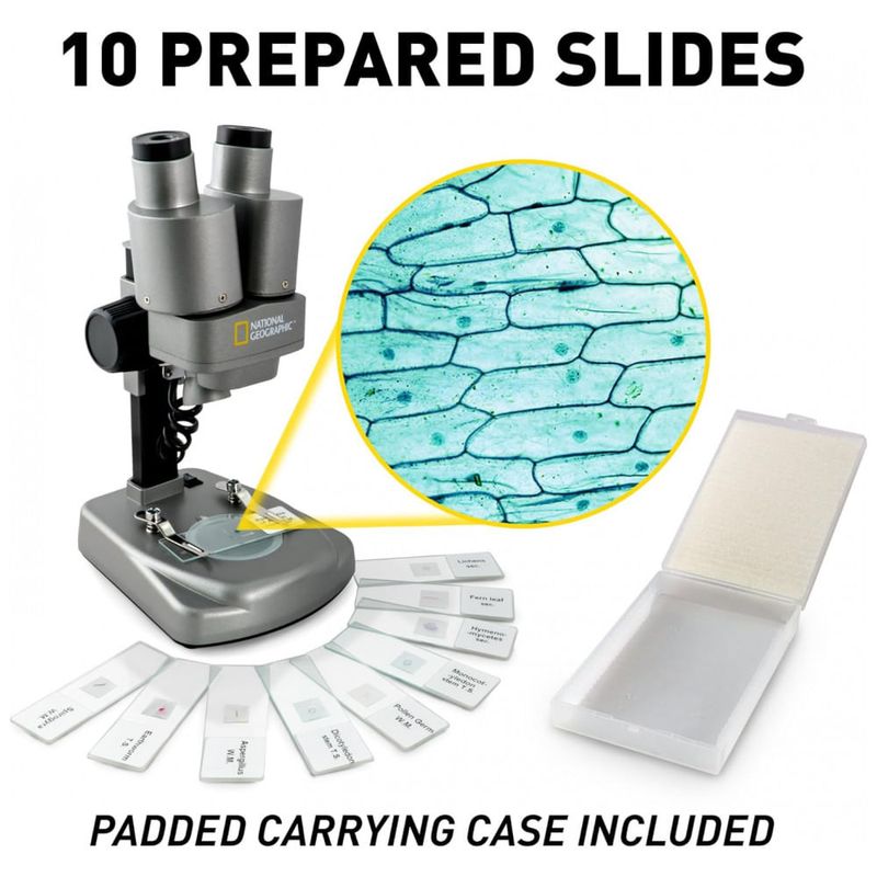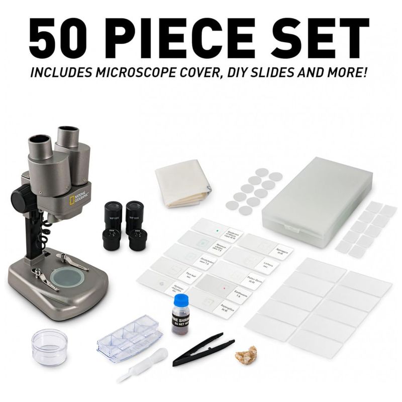 MAIS DE 50 ACESSÓRIOS INCLUÍDOS Explore um conjunto selecionado de 10 slides preparados com uma variedade de espécimes biológicos e, em seguida, crie o seu próprio com os slides e capas em branco incluídos, pinças e um conta gotas. Este kit completo também inclui uma placa de Petri para laboratórios de plantas, um mini geodo e muito mais