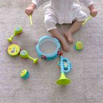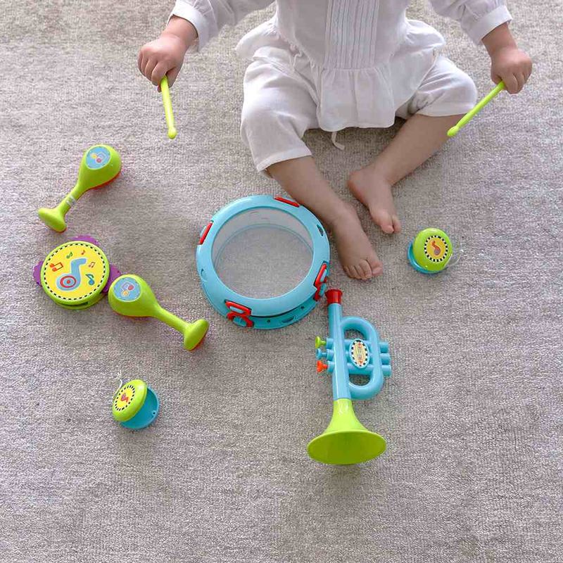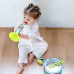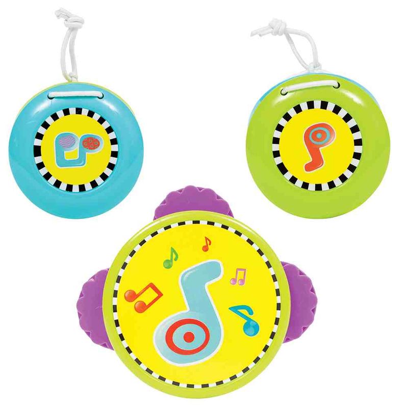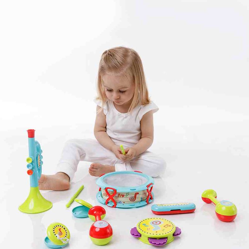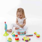 Com tambor, baquetas, trompete, castanholas, pandeiro, gaita e maracas, é ideal para desenvolver a coordenacao motora e os sentidos do pequeno, além de estimular o primeiro contato com instrumentos musicais.