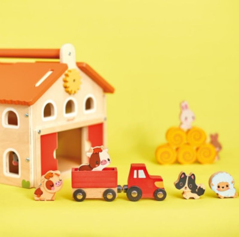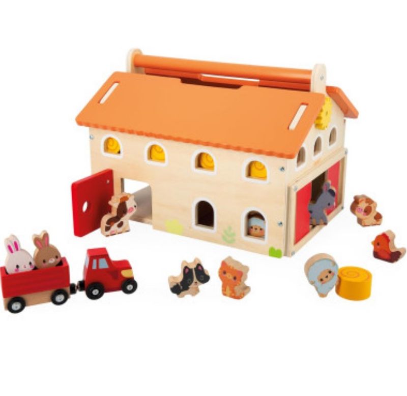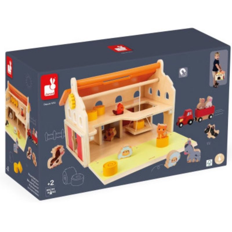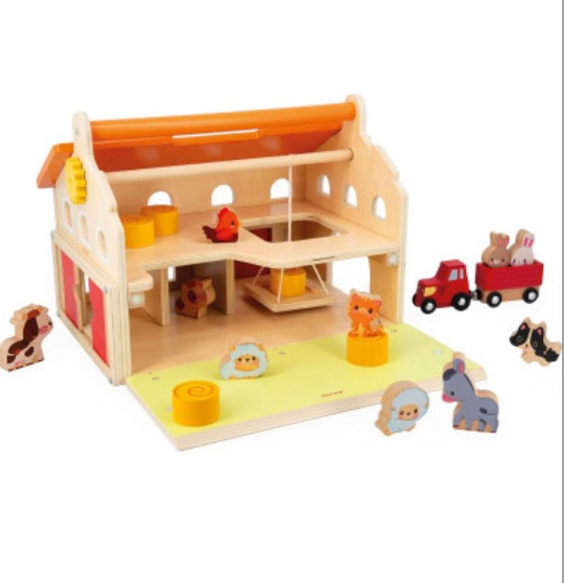 Esta fazenda realista vem com uma variedade de acessórios: 17 no total. 10 figuras de animais de fazenda (2 coelhos, 2 ovelhas, 1 gato, 1 cachorro, 2 vacas, 1 burro, 1 galinha), 5 fardos de palha e 1 trator com seu reboque magnético completam a casa. Para ainda mais brincadeira, a primeira fazenda do bebê está bem equipada: os pequenos fazendeiros vão adorar usar a polia para baixar e carregar os fardos de feno e depois levá-los para o campo com o trator de madeira. Além disso, nosso brinquedo de fazenda possui portas deslizantes e uma porta com dobradiças elásticas. Prático, o celeiro abre de duas maneiras diferentes para facilitar a brincadeira interna: as duas seções do telhado são removíveis e um dos lados da fazenda abre e fecha graças a um sistema magnético superinteligente. Isso permite fácil acesso às caixas de animais ou ao espaço de armazenamento para fardos de palha no andar de cima! Além disso, nossa fazenda de madeira tem uma alça de transporte, tornando-a um brinquedo educacional fácil de mover e instalar em qualquer lugar. Este brinquedo para crianças pequenas estimula a imaginação dos pequenos em um mundo que eles amam: o campo!