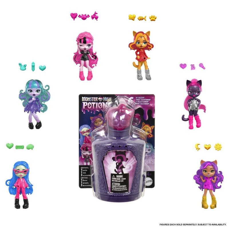 Mini Boneca Monster High PotionsFabricante: Mattel.Coleção: Monster HighDê o presente de uma boneca assustadora com Monster High Potions! Basta misturar a poção para uma surpresa assustadora. Cada frasco encantador vem com uma estatueta de 7 cm de um personagem Monster High favorito dos fãs, bem como três amuletos "mágicos" para diversão personalizável! Prepare em quatro etapas: despeje água e amuletos dentro do frasco, agite para ver a poção se formar, despeje a mistura e revele a boneca! Crianças de 4 anos ou mais vão adorar desempacotar, brincar e exibir esta última adição à sua coleção de caveiras Monster High. Cada uma é vendida separadamente, sujeito à disponibilidade. Os personagens podem variar. As bonecas não ficam em pé sozinhas. As cores e decorações podem variar.*Modelo Unitário e Surpresa