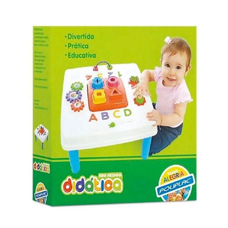 Mini Mesinha Didatica de Atividades - PoliplacInformações do Produto: A mini mesinha didática de atividades junta diversão e desenvolvimento de habilidades. Consiste em uma mesa desmontável e de fácil transporte com um tampão repleto de objetos com diferentes formatos, cores e que ajudam no desenvolvimento da concentração, coordenação motora, raciocínio lógico, tato e visão.Itens inclusos: 1 mesa de atividades, 2 cadeiras, 3 adesivos.Dimensões aproximadas do produto: Mesa AxLxC 49cm x 49cm x 44cm.Recomendado: Não recomendado para crianças menores de 03 anosAlimentação: Não necessita.Material composição: Plástico atóxico.Certificação: CE-BRI/IQB 4969 NM 300/2002. Ocp 0006.Garantia do Fabricante: 03 meses contra defeitos de fabricação.Aviso: Todas as informações divulgadas são de responsabilidade exclusiva do fabricante/fornecedor. As cores dos tecidos ou dos produtos podem variar entre as imagens mostradas acima ou fotos da embalagem. Imagens meramente ilustrativas.