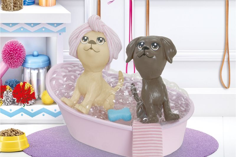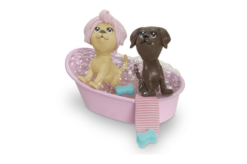 Itens inclusos: 02 Mini Pets, 02 Coleiras, 01 Banheira, 02 Esponjas em Formato de Ossinho, 01 Toalha de Banho e 01 Shampoo e 01 Condicionador em Papel Cartonado.