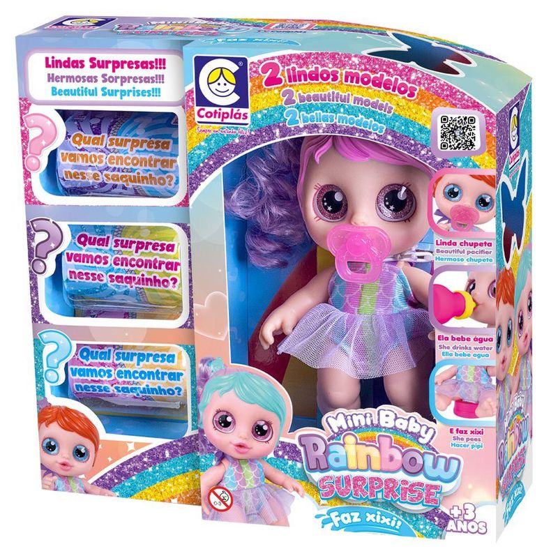 Ficha Técnica:Marca: Cotiplás;Nome do produto: Mini Rainbow Surprise Faz Xixi Com Mechas Lilás;Idade recomendada: A partir de 3 anos;Selo Inmetro: CE-BRI/IQB 0228 IQB-OCP 006;Contém: 1 boneca e 3 surpresas.