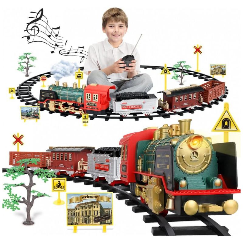 Conjunto de trem elétrico com controle remoto Compare com outros brinquedos de trem eletrônico, nosso conjunto de trem rc não inclui apenas motores de locomotiva, vagões de carvão, vagão de passageiros, vagão de carga, trilhos retos, trilhos curvos, sinais de trânsito, árvores, garrafa de água vazia, mas também equipar com controle remoto, baterias recarregáveis e cabos USB. As crianças podem controlar o trem para parar, avançar, acelerar ou retroceder. Além disso, ele pode ligar e desligar o som através do controle remoto quando estiver em execução.