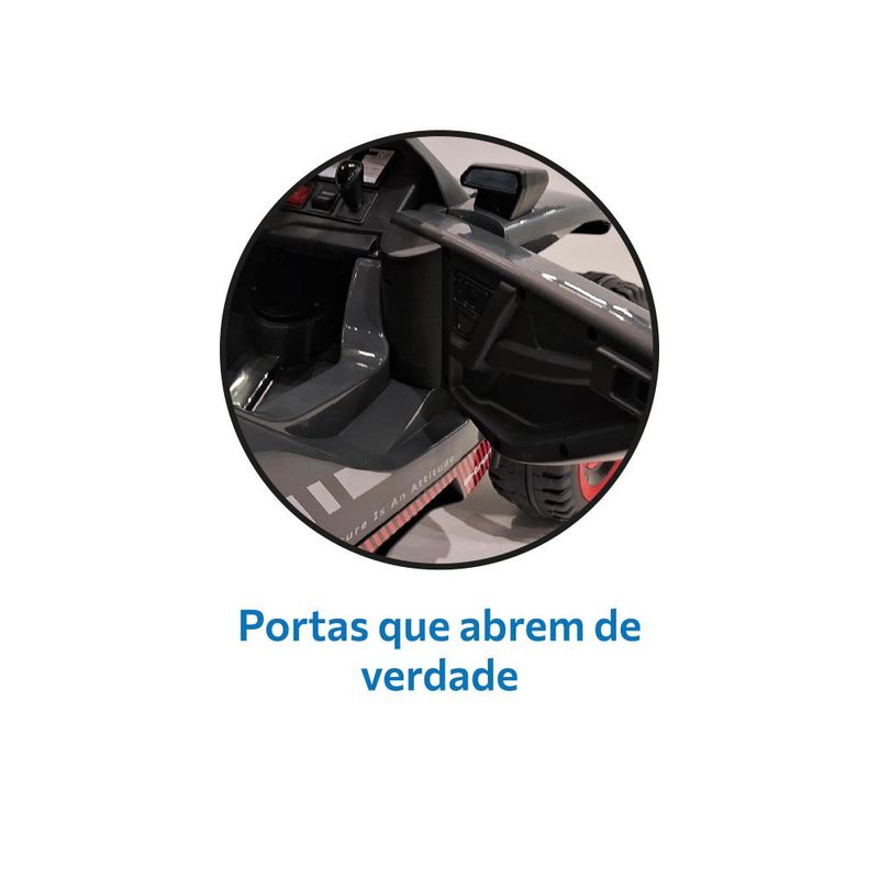 Portas que abrem de verdade; Farol Dianteiro e Lanterna Traseira que acende de verdade; Painel luzes, sistema de som, entrada USB, botões liga/desliga, duas velocidades e câmbio com frente /ré; Cinto de segurança; Controle Remoto Codificado 2,4G com 3 opções de velocidade. Idade Sugerida a partir de 3 anos; Peso suportado 25kg NUMERO DO REGISTRO INMETRO: 006473/2024 OCP: 0061