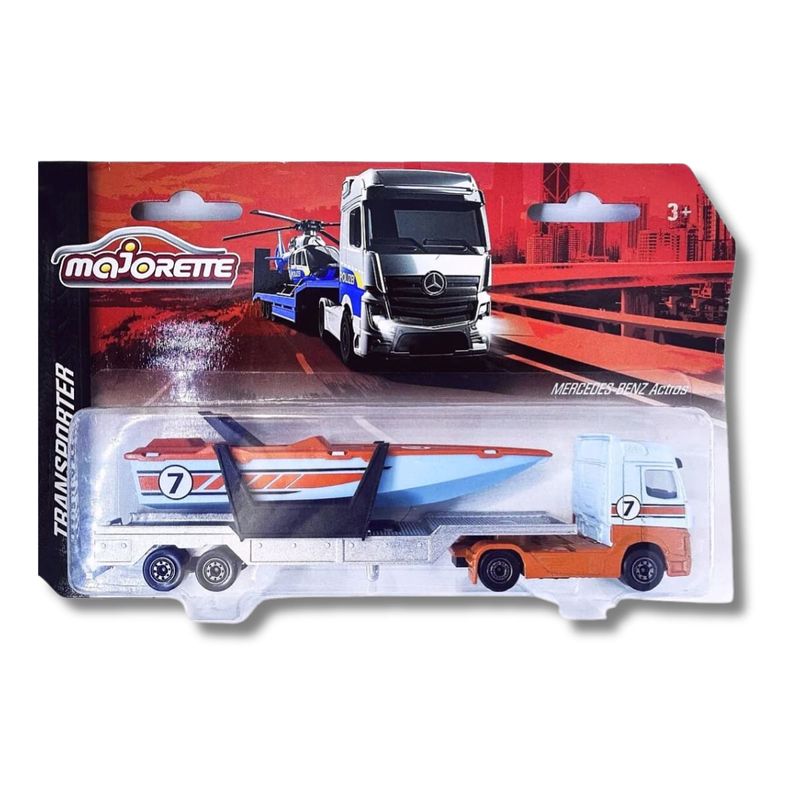 Miniatura caminhão Mercedes Benz Actros + Lancha, de linha Transporter, 19cm, Majorette.