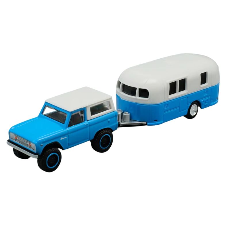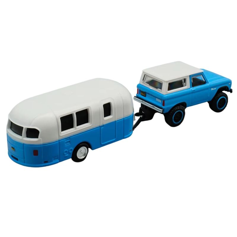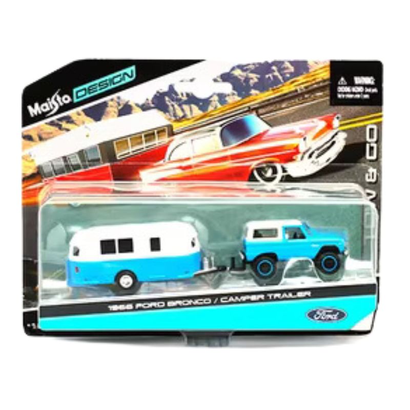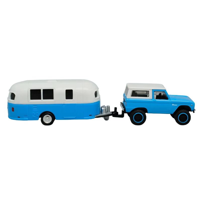 Miniatura de carro Ford Bronco, do ano 1966, c/ Trailer camper, da coleção Tow & Go, na escala 1:64.
