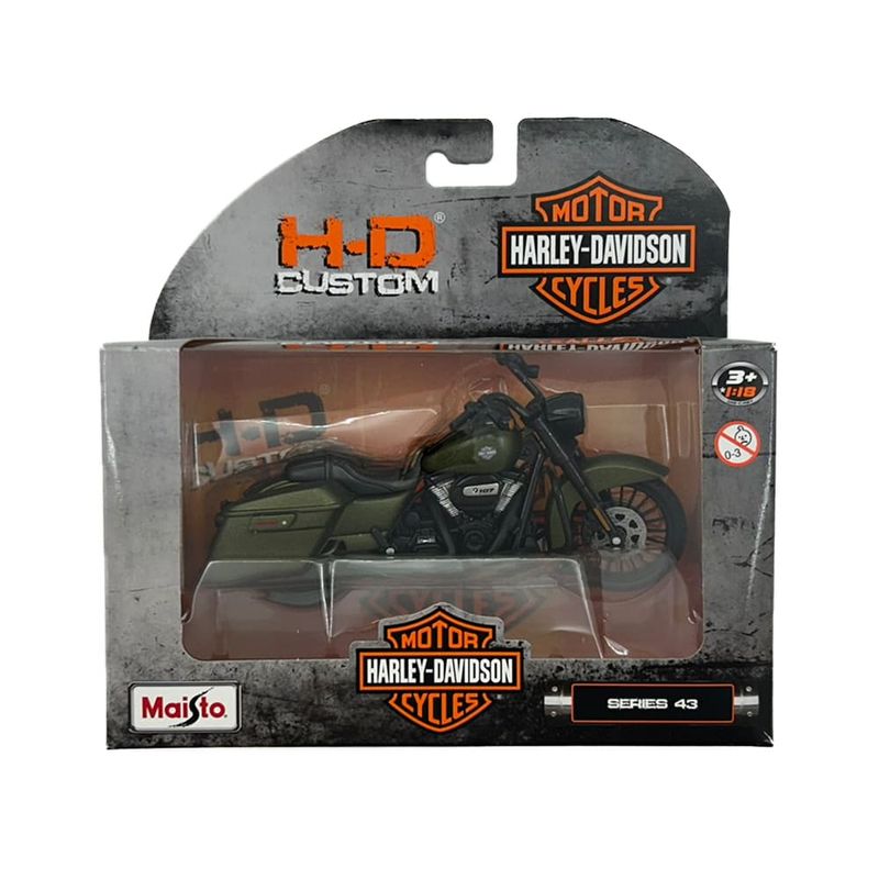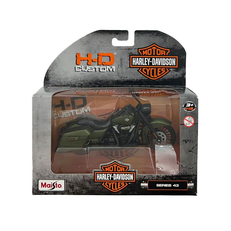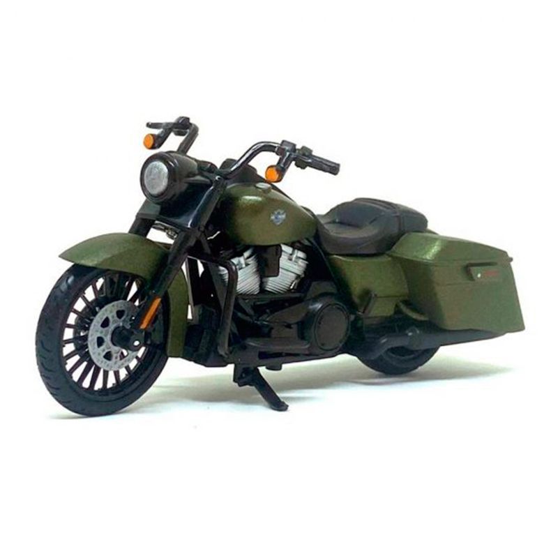 Maisto – Moto Harley-Davidson 2022 Road King Special Série 43 (Harley-Davidson Custom – Escala 1:18) Este modelo da Maisto representa a imponente Harley-Davidson Road King Special 2022, integrante da Série 43 da linha Harley-Davidson Custom. Com acabamento em verde, escala 1:18 e cerca de 12 cm de comprimento, a miniatura destaca o estilo touring com visual moderno e agressivo, voltado para desempenho e presença nas estradas. Detalhes do Produto: Fabricante: Maisto Linha/Série: Harley-Davidson Custom – Série 43 Modelo: Harley-Davidson 2022 Road King Special Montadora: Harley-Davidson Cor: Verde Escala: 1:18 Comprimento aproximado: 12 cm Composição: Metal, plástico e borracha Idade recomendada: A partir de 3 anos Dimensões da embalagem: 6,5 cm x 18 cm x 10,7 cm Com estrutura robusta, guidão elevado e acabamento detalhado, a Road King Special Série 43 é ideal para composições temáticas, vitrines de motocicletas touring ou coleções dedicadas à linha contemporânea da Harley-Davidson. Os elementos visuais exclusivos da Série 43 reforçam o caráter autêntico e estilizado da miniatura, tornando-a uma peça de destaque na coleção.