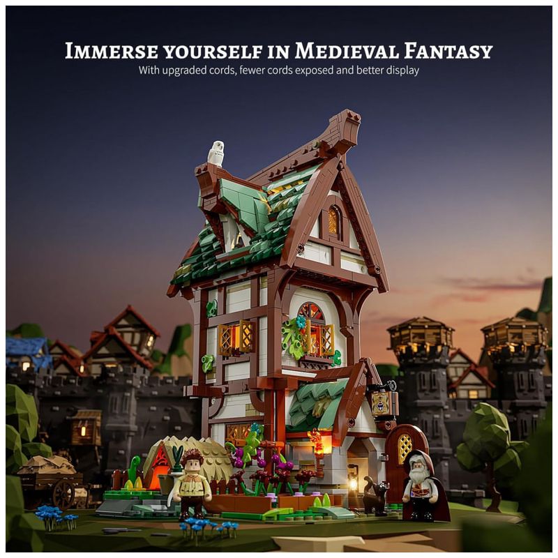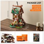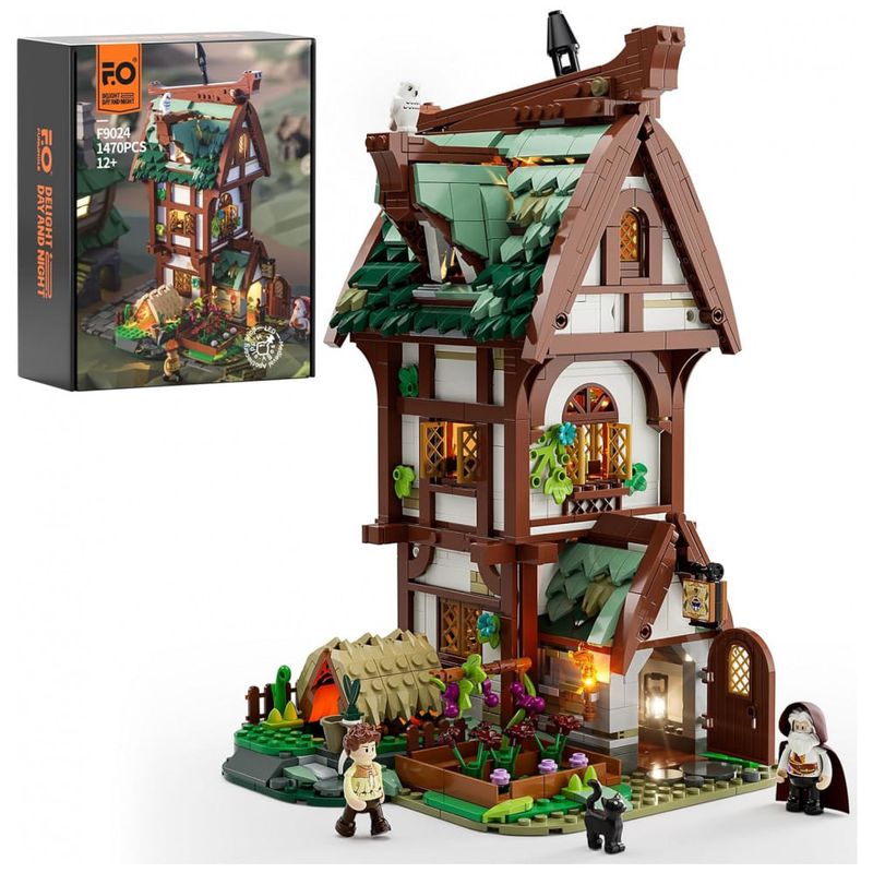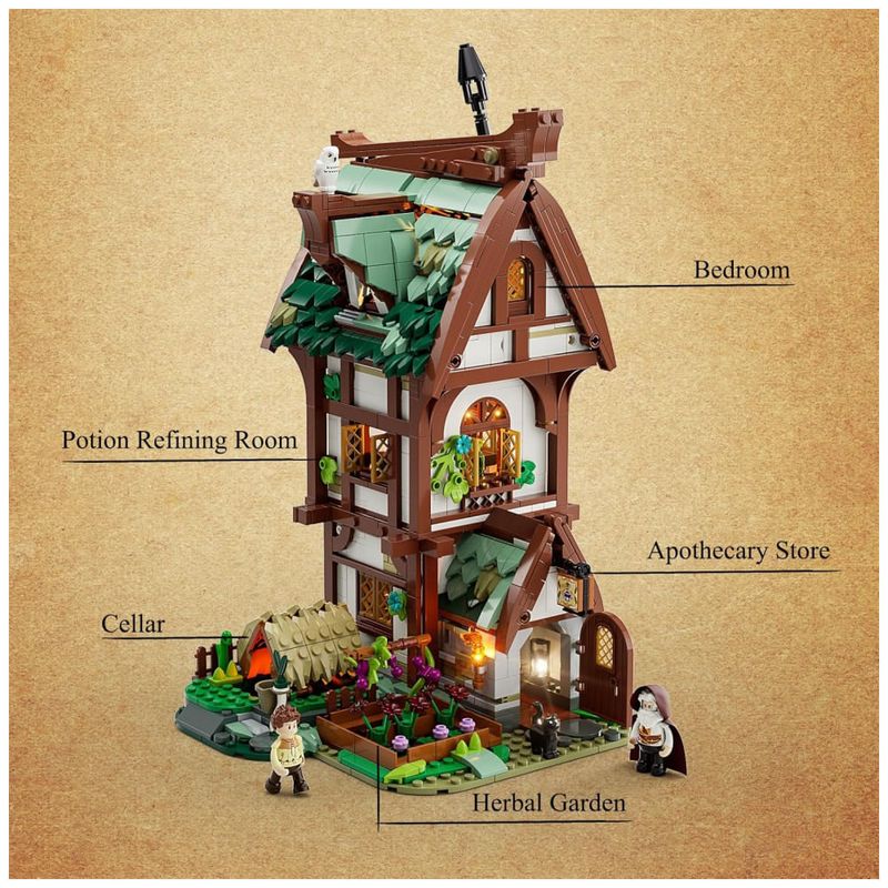 O conjunto para montar FUNWHOLE Loja de Botica Medieval é formado por 1470 peças plásticas de encaixe rígido padrão, projetadas para reproduzir com precisão um edifício de três andares e um pequeno jardim de ervas. Cada andar possui função distinta: o térreo representa a loja de vendas, o segundo andar o espaço para refino de poções, e o terceiro o dormitório. O modelo inclui duas miniaturas articuladas (boticário e aprendiz) e dois animais, um coruja branca e um gato preto, que complementam a cena medieval.