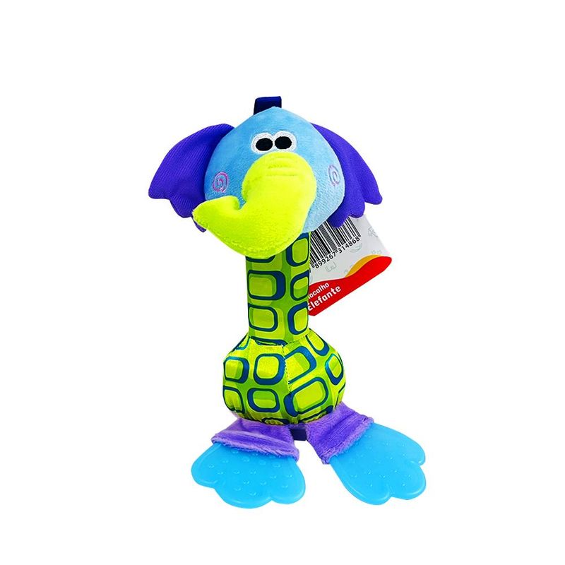 Chocalho de elefante colorido para bebês. Estimula coordenação motora e sentidos.