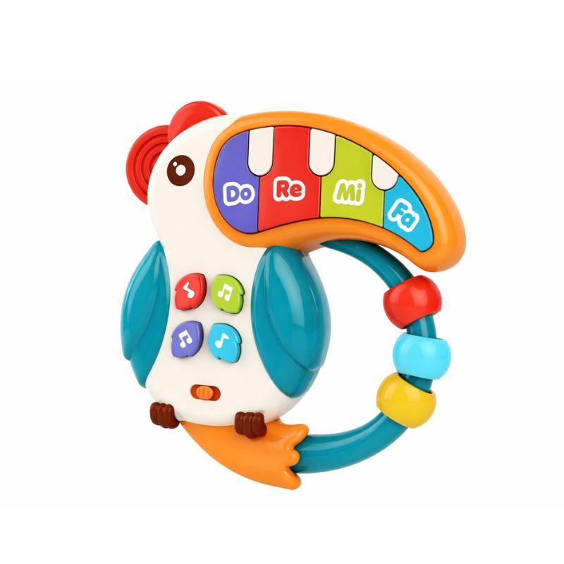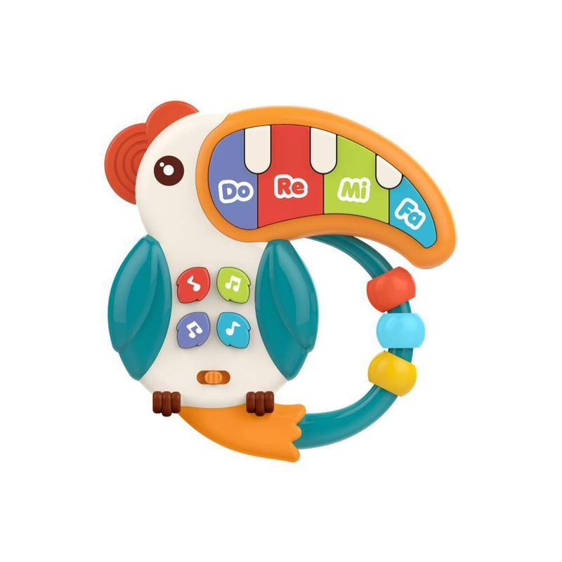Brinquedo em formato de tucano com peças interativas que ajudam a desenvolver a coordenação motora do bebê.