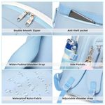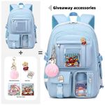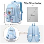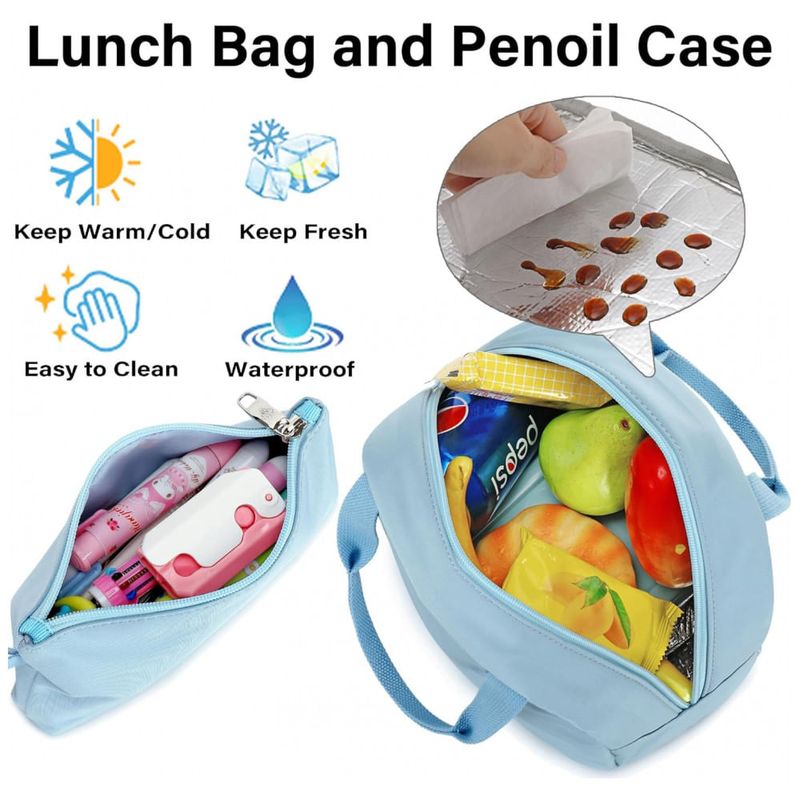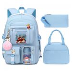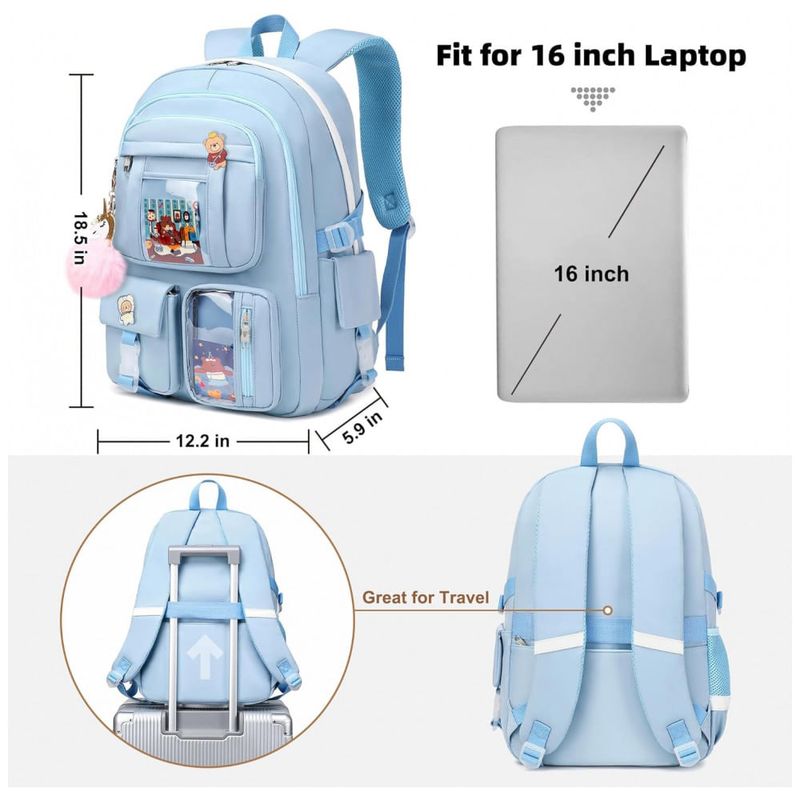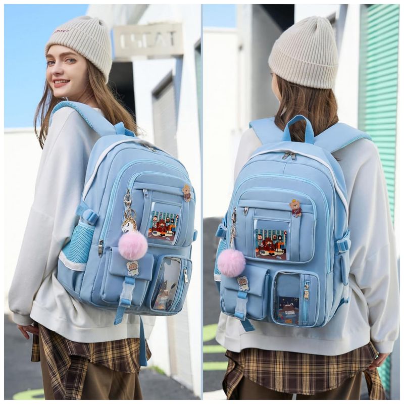 Conjunto 3 em 1 composto por mochila, lancheira e estojo em estilo kawaii, indicado para adolescentes, estudantes universitárias e mulheres que buscam uma mochila para escola, faculdade, trabalho e pequenas viagens. A mochila principal tem aproximadamente 31 cm de largura, 15 cm de profundidade e 45 cm de altura, com compartimento acolchoado que comporta notebooks e tablets de até 16 polegadas, além de acompanhar pingente pompom e badge decorativo.