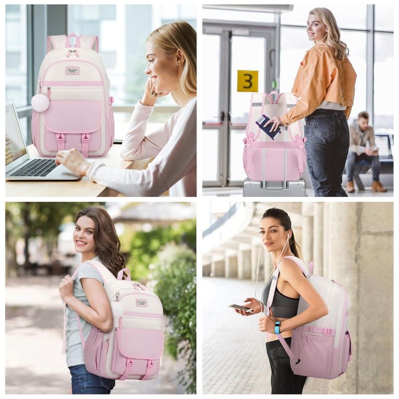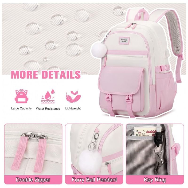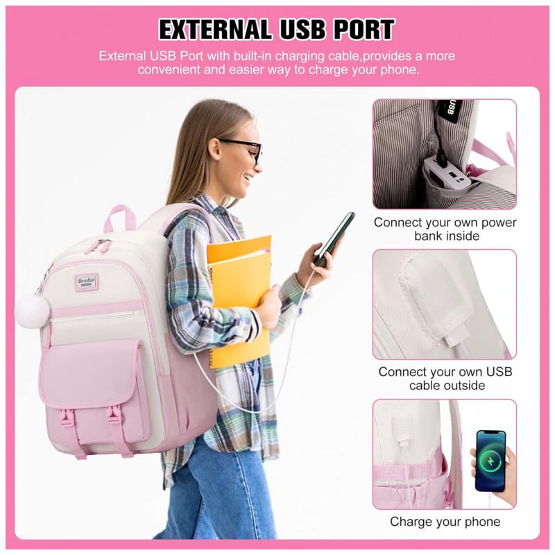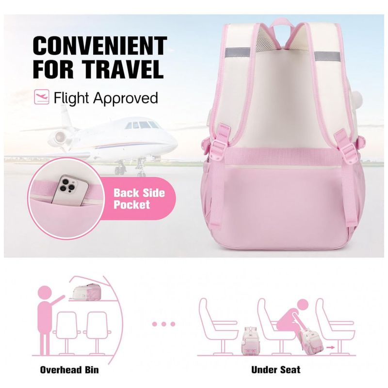 O exterior traz dois bolsos frontais com zíper para itens de acesso rápido, dois bolsos laterais para garrafa ou guarda-chuva e bolso traseiro antifurto para objetos mais sensíveis. O tecido em poliéster é leve, impermeável e combinado a alças em formato “S” acolchoadas com espuma respirável, cinta traseira para encaixe em malas de viagem e porta USB externo com cabo interno para conexão a power bank, mantendo o uso prático em deslocamentos diários.