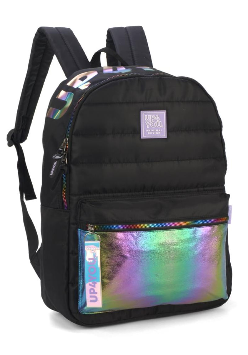 Mais um modelo holográfico colorido, agora em nylon e matelassê da coleção Play no Futuro UP4YOU, essa mochila é a escolha perfeita para os estudantes que buscam conforto e praticidade. Possui alças acolchoadas e reguláveis altamente resistentes e confortável para ser transportada. Possui bolso frontal com fechamento em zíper colorido e personalizado da marca e logo emborrachado dando um toque moderno ao design. Modelo: MS46588UPCompartimento único Bolso frontal com zíper coloridoSem bolsos lateraisAlças traseiras ajustáveisZíper personalizado da marcaMaterial: Nylon e matelassê Dimensões: 45x32x15 (AxLxP) Peso: aprox. 600 gramas • Cuidados com a sua mochila Up4You: Não lavar na máquina Não esfregar ou passar produtos químicosNão utilizar ferro de passar ou colocar na secadora • Para limpar, utilizar apenas água sabão neutro, passar o pano na região suavemente retirando a sujeira para que não danifique o tecido.