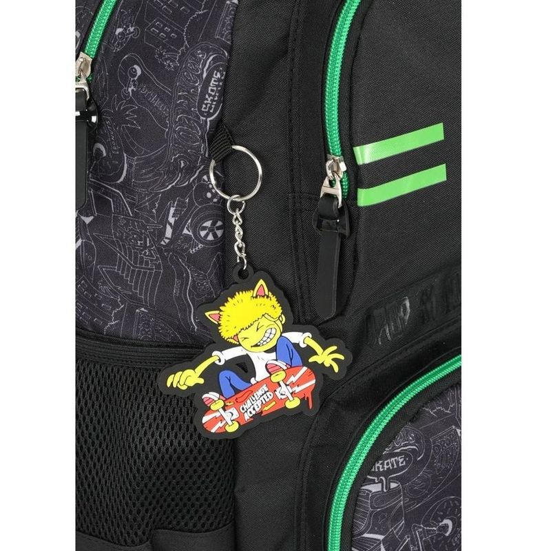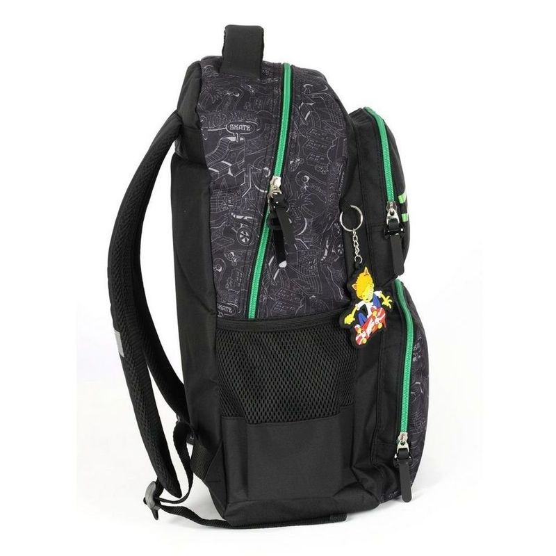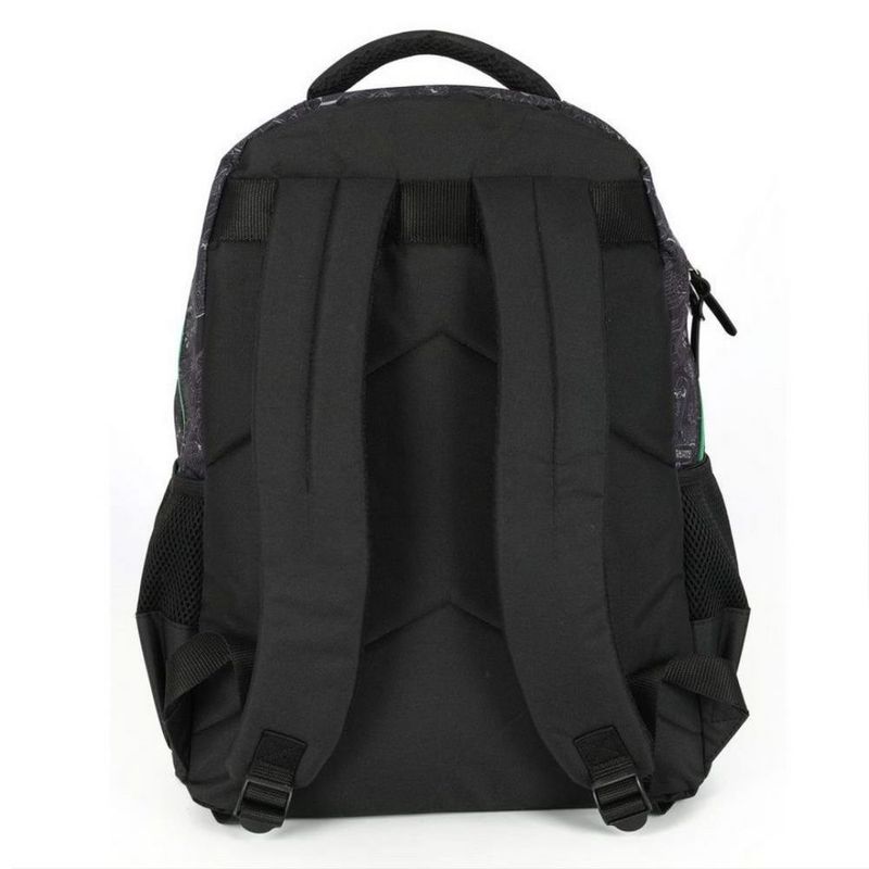 Design/Cor: Predominantemente Preto, com detalhes em Verde nos zíperes, contornos de bolsos e na estampa.