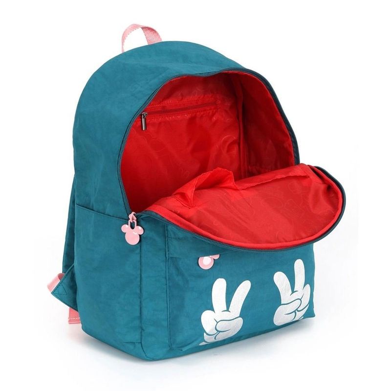 A mochila possui um bolso frontal de médio porte, também com zíper tratorado, e conta com detalhes refinados, como os zíperes personalizados em metal, que completam o visual. O revestimento interno em tecido nylon estilizado apresenta elementos do adorado personagem Disney Mickey Mouse.