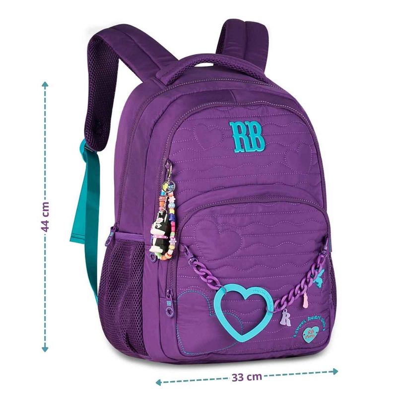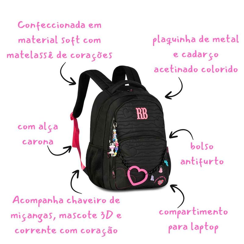 A Mochila Rebecca Bonbon Heart Beats 2026 é a união perfeita entre moda e volta às aulas. Feita em material soft com matelassê de corações, possui compartimento para laptop, bolso antifurto e alça carona. Acompanha chaveiros exclusivos de miçangas, corrente com coração e mascote 3D da famosa bulldog.