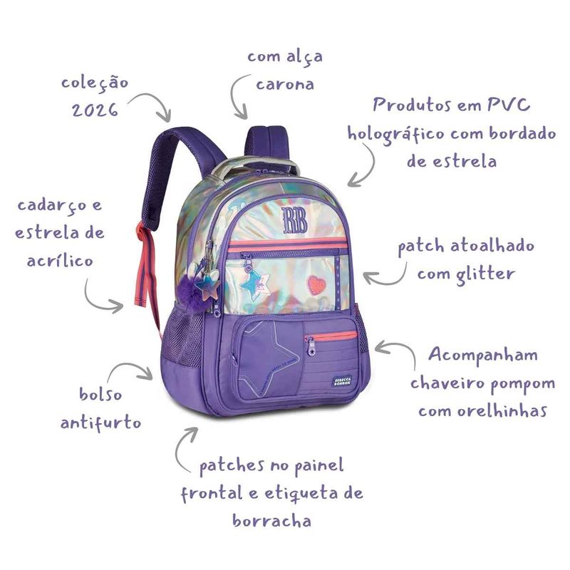 Apresentando a Coleção Holo Shine 2026, a mochila Rebecca Bonbon combina PVC holográfico, bordado de estrela e patch atoalhado com glitter. Modelo grande de 17,5 polegadas, possui bolso antifurto e alça carona, sendo ideal para a volta às aulas com muito estilo e segurança. Acompanha chaveiro pompom exclusivo.
