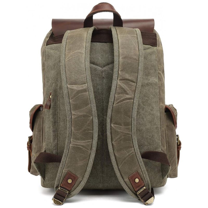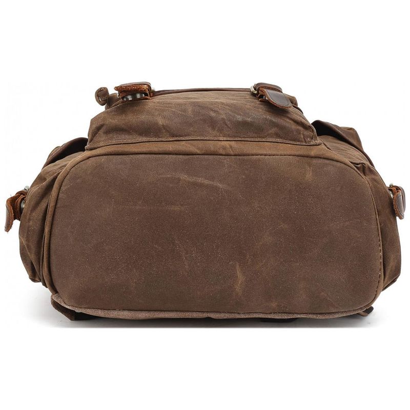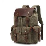 Mochila com aba de lona encerada, encerado à prova dágua, aba superior de couro Crazy Horse marrom resistente e cintos, ferragens de cobre, fechos magnéticos, cordão na parte superior, bolsos funcionais, design clássico que nunca fica atrás da tendência.