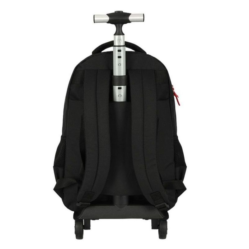 Rodinhas e Carrinho: Possui um carrinho com rodinhas e alça retrátil de metal/alumínio, ideal para puxar a mochila.