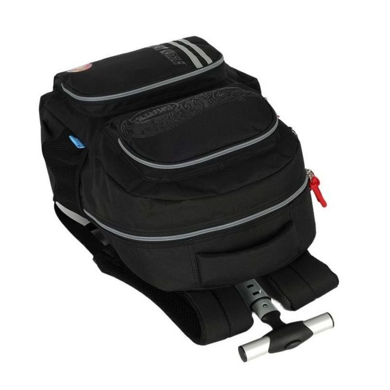 Design e Cor: A mochila é predominantemente preta, com o tema Hot Wheels Skate.
