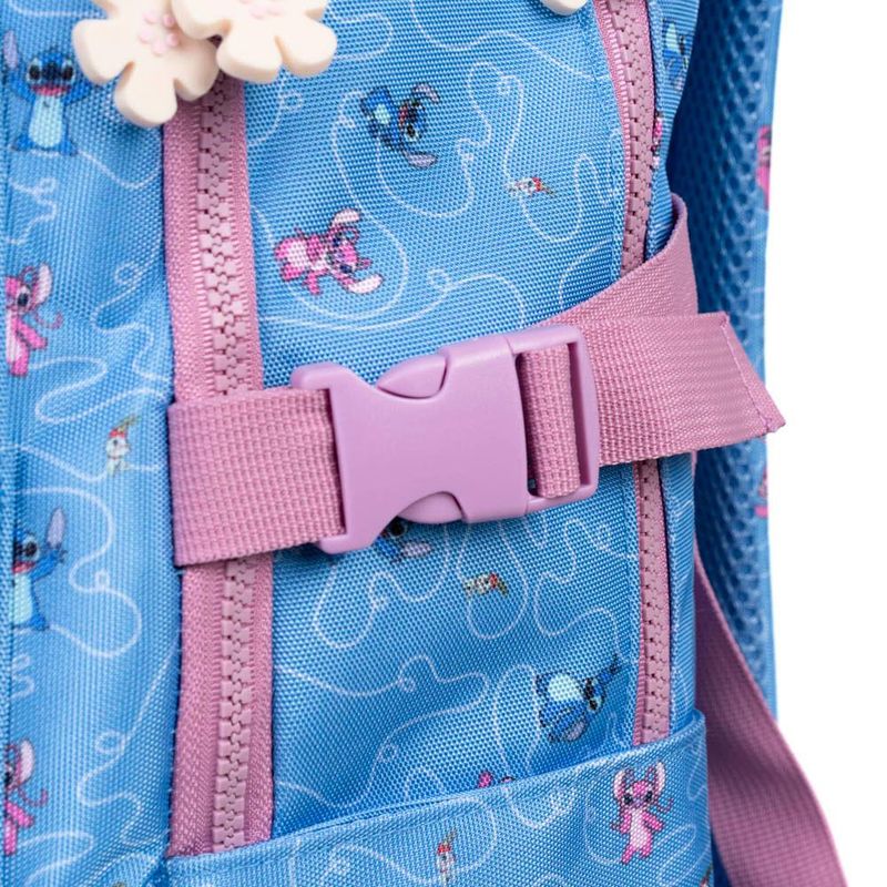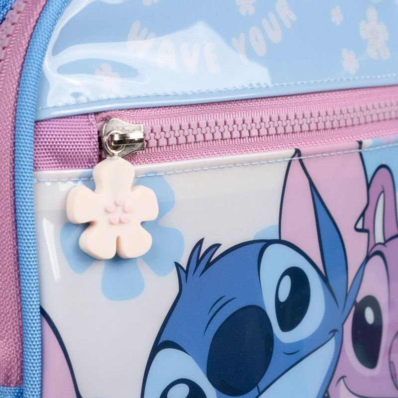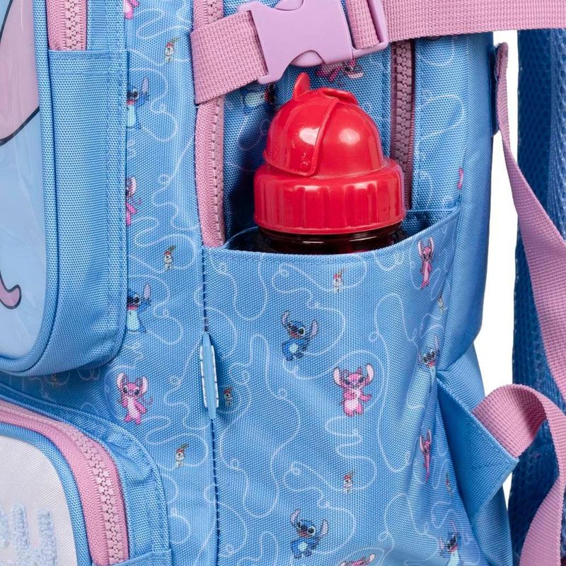 A mochila apresenta uma estampa superdivertida do Stitch e Angel, destacando-se pelo visual colorido e lúdico que as crianças adoram.