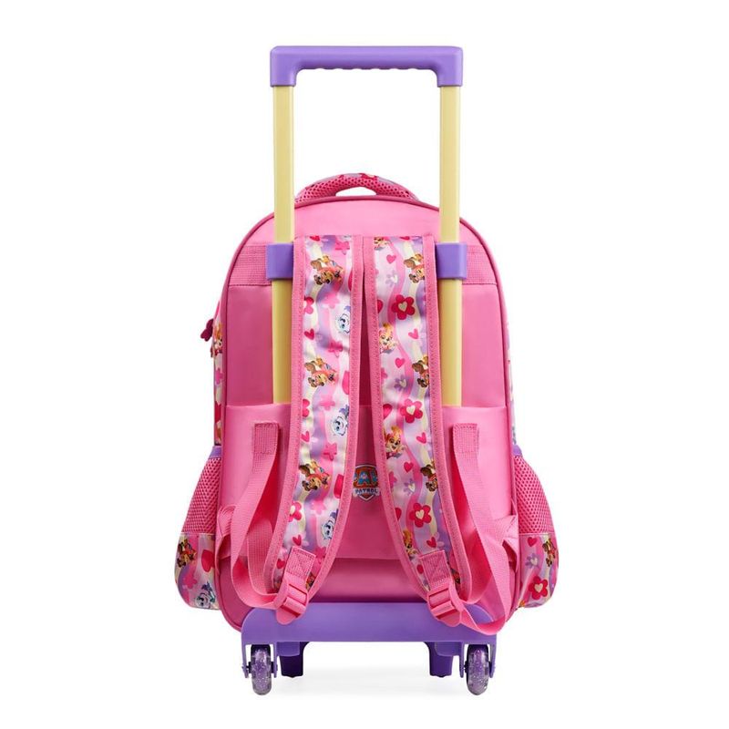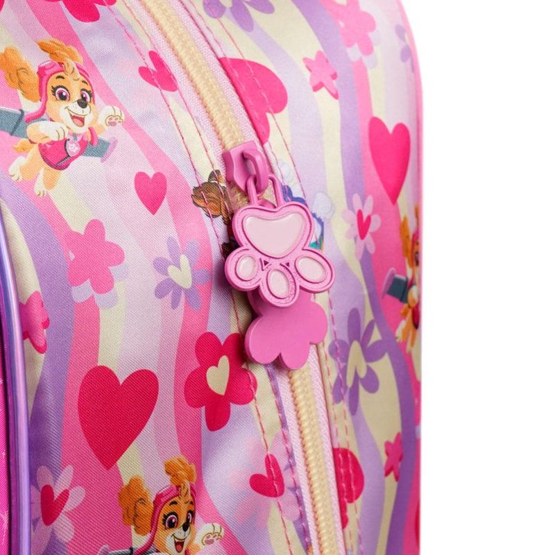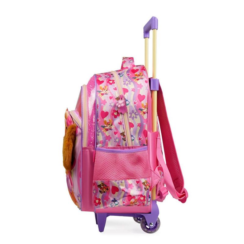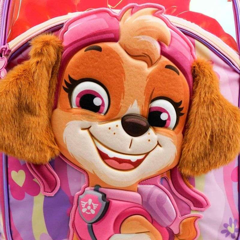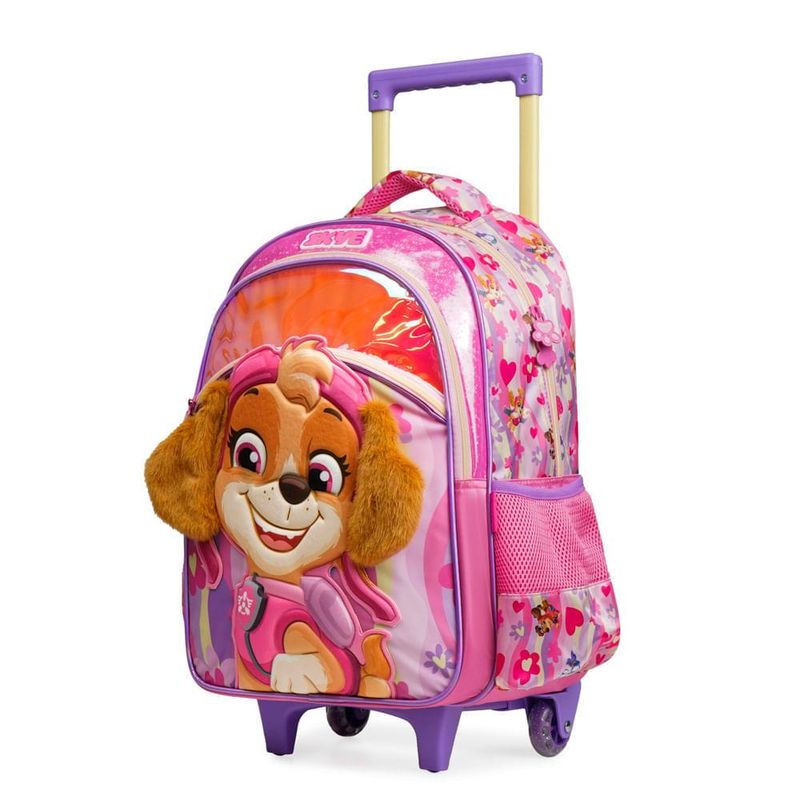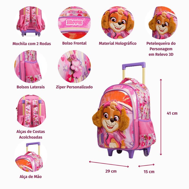 A Mochila com 2 Rodas Skye vai encantar os fãs da Patrulha Canina com um design cheio de detalhes especiais. Produzida em material resistente, traz aplicação em alto-relevo da Skye no painel frontal, com orelhinhas em pelúcia que deixam o visual ainda mais divertido. O acabamento combina estampas coloridas e alegres, além de puxadores personalizados em formato de patinha. Conta com puxador retrátil, duas rodas que facilitam o transporte e alças e costas acolchoadas, garantindo conforto quando usada nos ombros. Os bolsos laterais em tela são ideais para garrafinhas e pequenos acessórios, e a alça carona permite acoplar a mochila em malas maiores, trazendo praticidade extra para viagens.