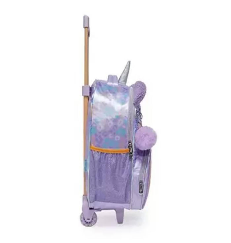 Mochila Rodinha G Escolar Pack Me Sweet Leopardo Confeccionada em cetim com estampa corrida Painel frontal de paetês com patch de plush e bordado ao redor Patch de PVC com logo impresso em silk e baixo relevo no bolso frontal Bolso frontal com arco-íris em patch de fleece Puxadores de zíper plásticos com logo em baixo relevo Etiqueta de identificação em silk no painel das costas