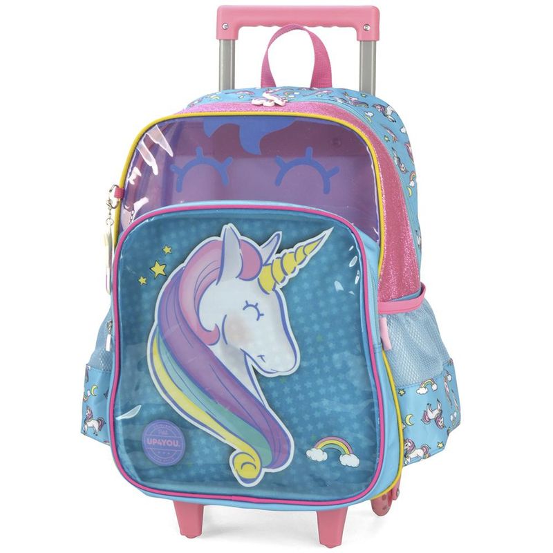 MOCHILA DE RODINHAS LUXCEL SEM ALÇA UNICÓRNIO Mochila de rodinha com estampa divertida, com bolso frontal. Fechamento em zíper, logo da marca na parte frontal e etiquetas personalizadas Características Principais: Dimensões: 41 x 30 x 14 (AxLxP). Volume: 17 Litros. Composição: 70% Poliéster e 30% EVA / Forro: 100% Poliéster. Garantia contra defeitos de fabricação.