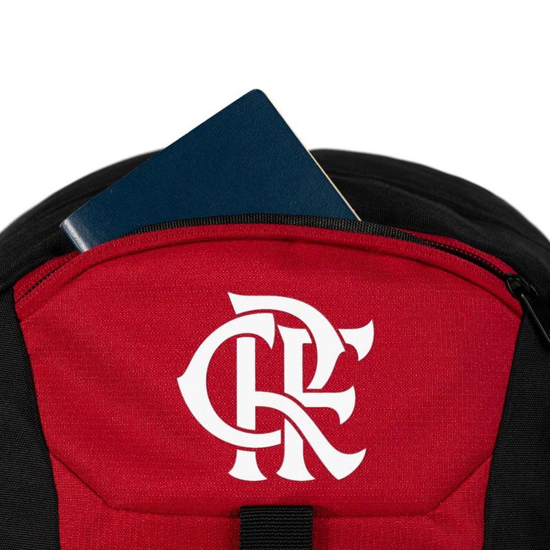 A mochila traz o escudo oficial do Flamengo bordado em destaque, reforçando o orgulho pelo time em qualquer ocasião.