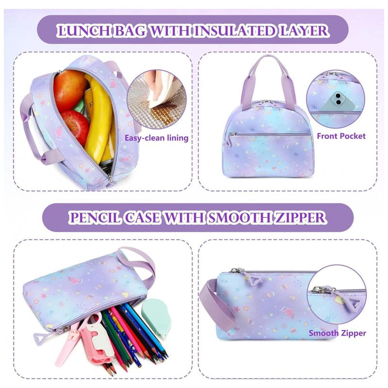 Conjunto escolar 3 em 1 composto por mochila de aproximadamente 41 cm, lancheira térmica e estojo, indicado para jardim de infância, ensino fundamental, ensino médio e uso diário. A mochila conta com compartimento principal espaçoso com divisória acolchoada para notebook de até 16", bolso intermediário e três bolsos frontais para pastas padrão, cadernos, estojo e pequenos acessórios, além de dois bolsos laterais para garrafas ou guarda-chuva; a lancheira isolada oferece espaço para recipientes de refeição e bebidas, e o estojo é adequado para lápis, canetas e cartões.