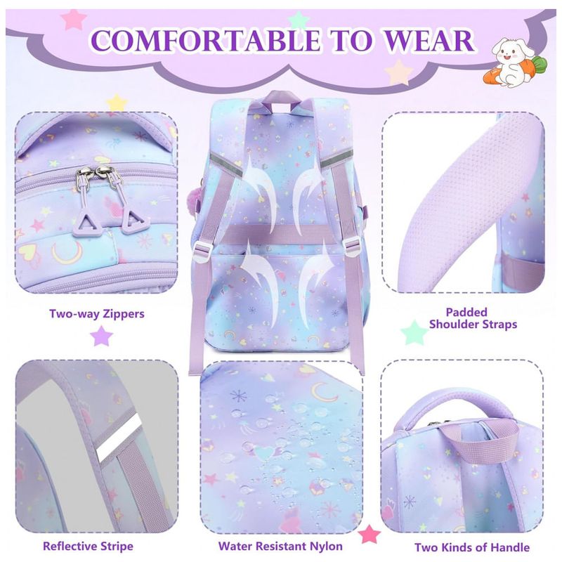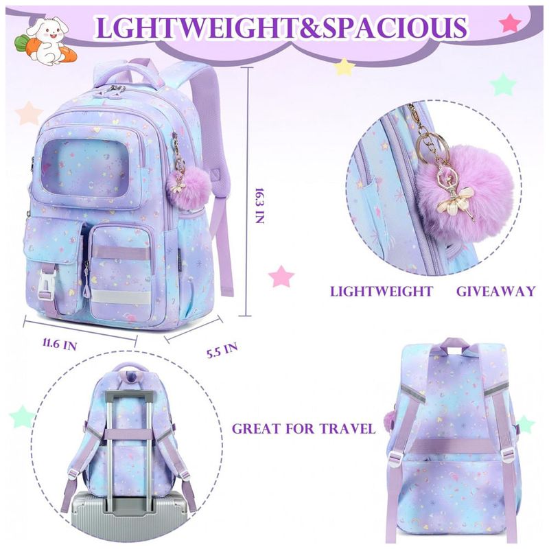 Mochila escolar em tamanho aproximado de 32 cm x 15 cm x 45 cm, indicada para meninas em idade escolar do ensino fundamental e médio, bem como para uso diário em passeios e viagens curtas. O design em tom roxo com elementos de princesa e padrão clássico infantil inclui pingente decorativo em pompom removível, tornando o modelo adequado para uso escolar e recreativo.