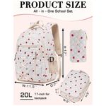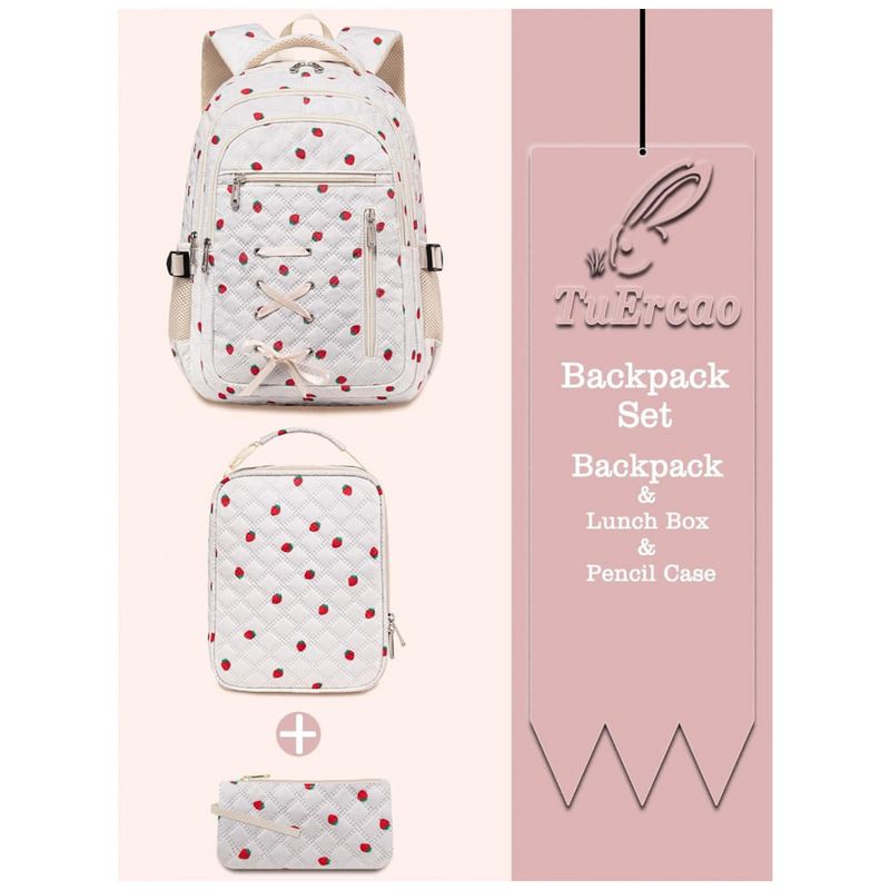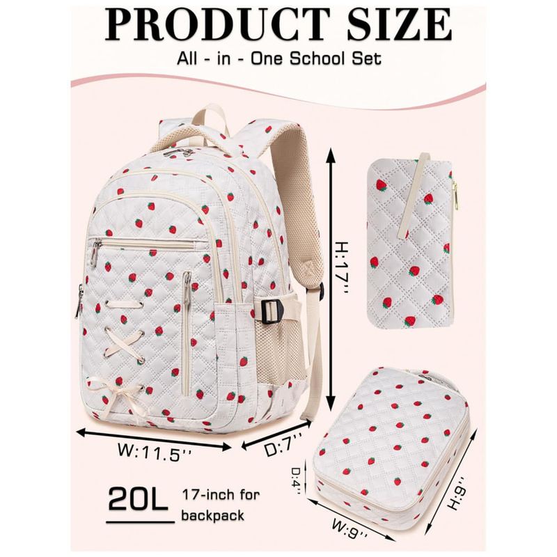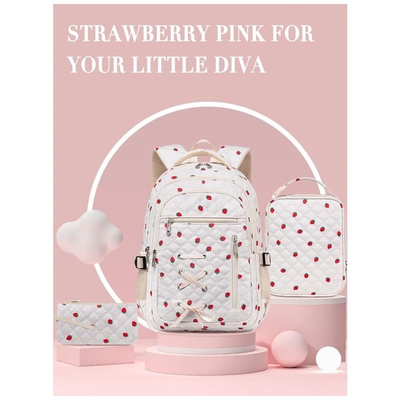 Conjunto escolar composto por mochila de 17", lancheira e estojo, com estampa de morangos em estilo infantil, indicado para crianças e adolescentes de aproximadamente 8 a 14 anos. A mochila possui compartimento principal com divisórias dedicadas para notebook e tablet, espaço para livros, fichários e pastas, segundo compartimento para revistas com porta-canetas, terceiro compartimento para tarefas e bolsos adicionais, incluindo bolso frontal transparente para pequenos objetos, bolsos laterais em tela para garrafas e guarda-chuva e bolso frontal inferior para acomodar o estojo.