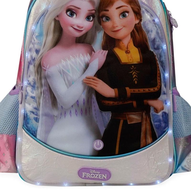 A Mochila Escolar Feminina Infantil Frozen Azul Claro traz um design cheio de brilho e detalhes que encantam em qualquer ocasião. Produzida em material resistente, combina diferentes texturas que valorizam o visual: acabamento holográfico nas laterais, painel frontal com aplicação das personagens em alto-relevo e efeito perolado que reflete a luz. O bolso frontal conta om iluminação em LED acionada por botão, adicionando um toque interativo e divertido. Para o dia a dia, as alças e costas acolchoadas oferecem conforto, enquanto os bolsos laterais em tela são ideais para levar garrafinhas ou pequenos acessórios. O modelo ainda vem com alça carona, que permite acoplar a mochila em malas maiores, trazendo mais praticidade para viagens.