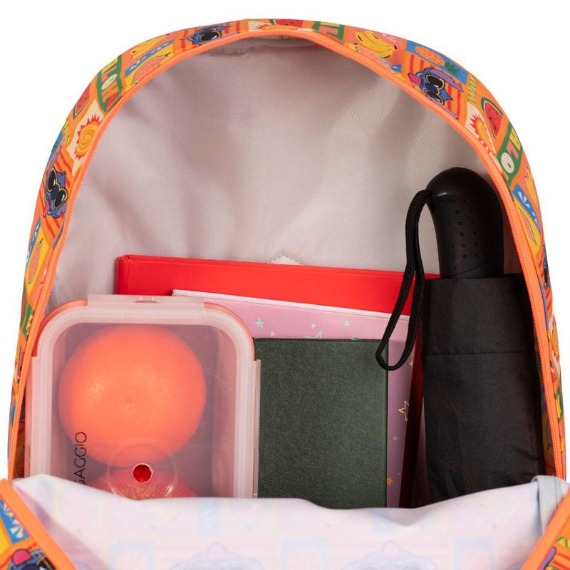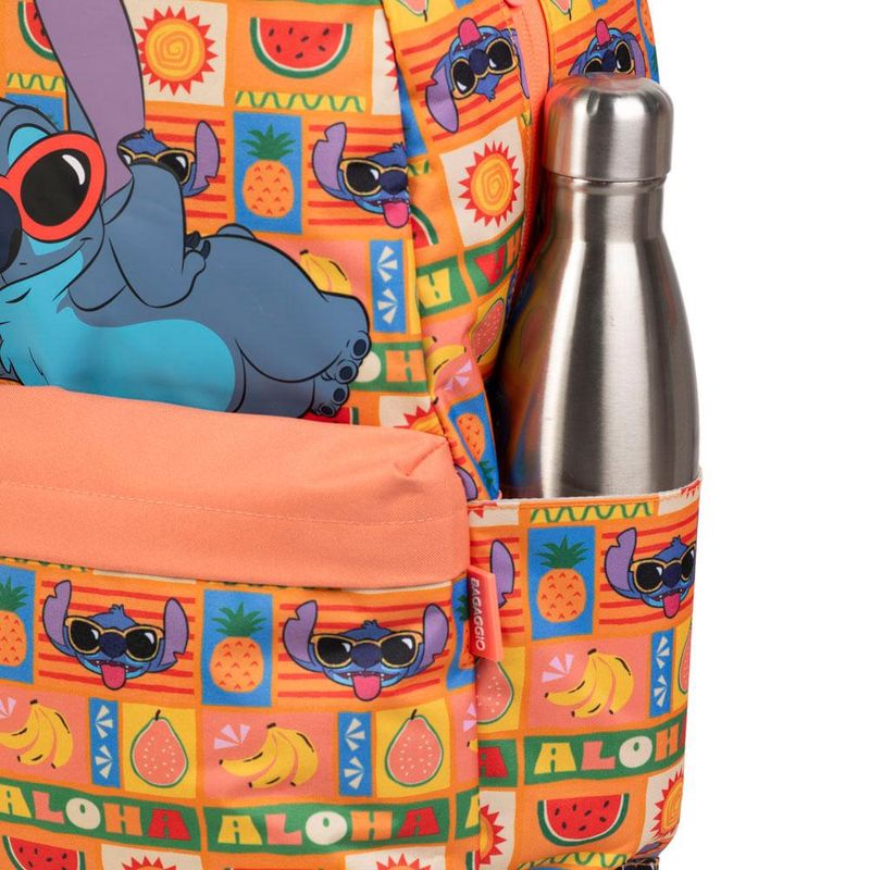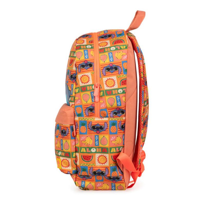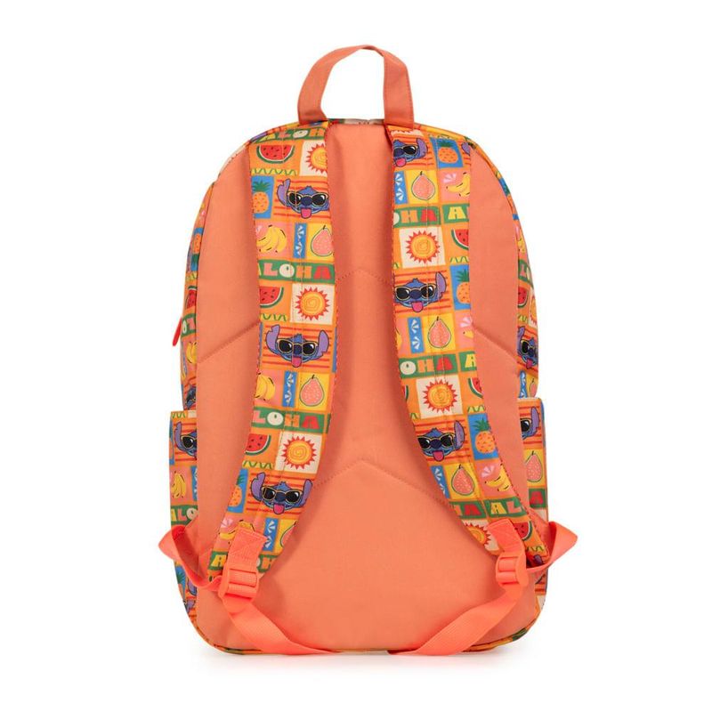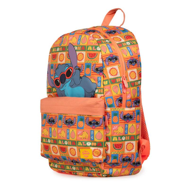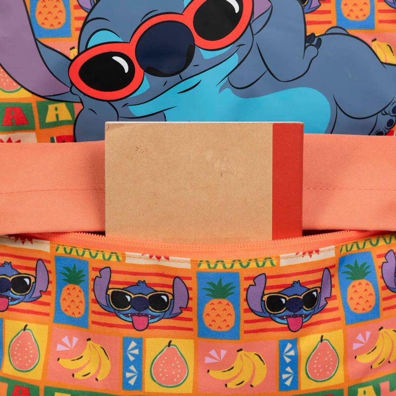 A mochila apresenta uma estampa divertida com o Stitch usando óculos de sol, rodeado de frutas e símbolos tropicais, criando uma vibe descontraída e cheia de cor.