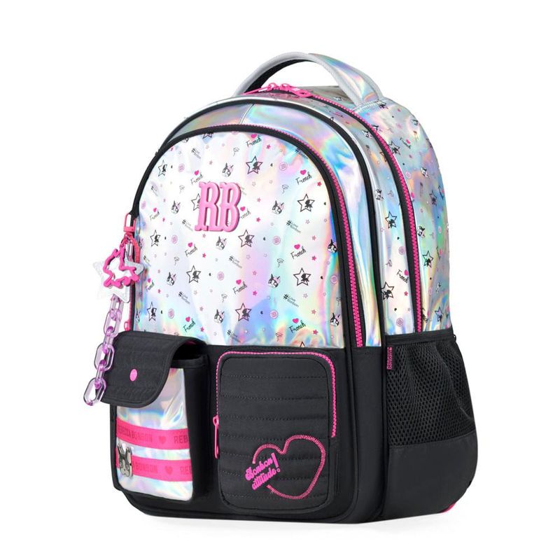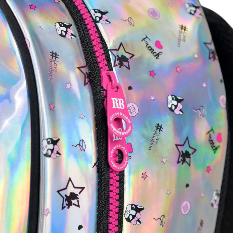 A Mochila Rebecca Bonbon Rainbow 25T é a escolha perfeita para quem ama brilho, estilo e muita atitude! Com um design moderno e vibrante, o acabamento holográfico com estrelas e corações coloridos reflete diferentes tons conforme a luz, trazendo um visual único e cheio de personalidade.