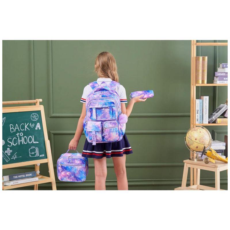 O conjunto é produzido em poliéster leve, resistente e repelente à água, com costuras reforçadas e zíperes de abertura suave, adequado ao uso diário em ambiente escolar e em atividades ao ar livre. As alças de ombro da mochila são acolchoadas com espuma espessa, possuem desenho ergonômico e fivela peitoral que auxilia na distribuição de peso e redução de deslizamentos, enquanto o painel traseiro acolchoado com material respirável aumenta o conforto. A lancheira possui isolamento térmico de parede dupla para manter alimentos e bebidas em temperatura adequada, e o estojo com bom volume interno ajuda a organizar lápis, canetas e outros acessórios escolares.