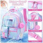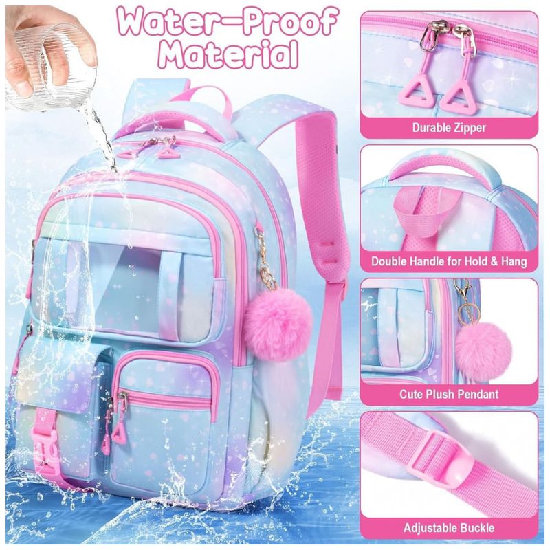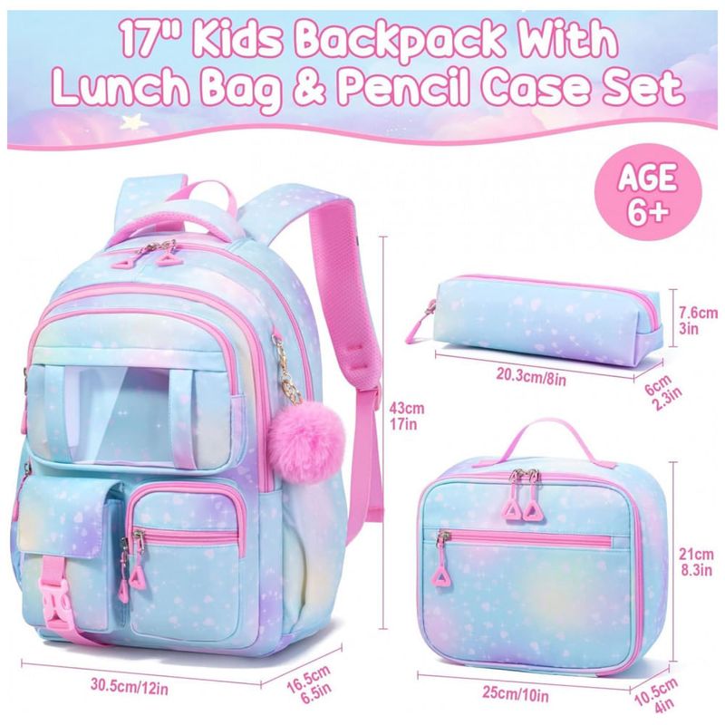 Conjunto escolar 3 em 1 composto por mochila, lancheira térmica e estojo, em tom azul com detalhes em formato de corações, indicado para meninas a partir de 6 anos no ensino fundamental e médio. A mochila mede aproximadamente 43 cm de altura, 30 cm de largura e 17 cm de profundidade, com seis compartimentos de tamanhos diferentes e dois bolsos laterais, permitindo acomodar notebook de até 15,6", livros, cadernos, pastas em formato A4 e demais materiais escolares, além de três bolsos frontais para acesso rápido e bolso transparente para visualização imediata de pequenos itens.
