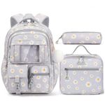 Conjunto escolar 3 em 1 composto por mochila, lancheira térmica e estojo, com estampa de margaridas sobre fundo cinza, indicado para crianças a partir de 6 anos no ensino fundamental e médio. A mochila tem aproximadamente 43 cm de altura, 30 cm de largura e 17 cm de profundidade, com seis compartimentos de tamanhos diferentes e dois bolsos laterais, permitindo acomodar notebook de até 15,6", livros, cadernos, revistas, pastas em formato A4 e demais materiais, além de três bolsos frontais de acesso rápido e bolso transparente para visualização imediata de pequenos itens.