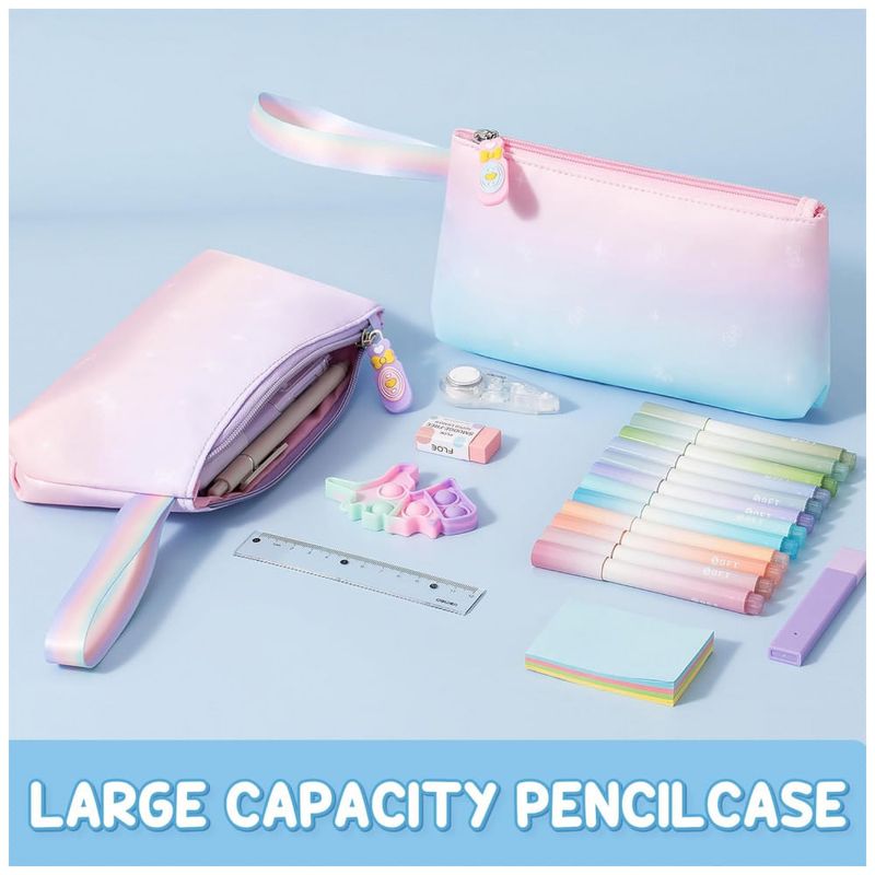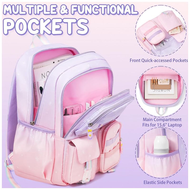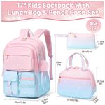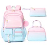 Conjunto escolar 3 em 1 composto por mochila em degradê de cores, lancheira térmica e estojo, indicado para crianças e adolescentes em idade pré-escolar, ensino fundamental e médio. A mochila possui compartimento principal com sleeve acolchoado para notebook ou tablet de até 15", espaço para livros e cadernos, seções intermediárias com zíper para cadernos e estojos, bolso transparente para horários ou fotos, quatro bolsos frontais para lanches e pequenos objetos e dois bolsos laterais com elástico para garrafas e guarda-chuva.