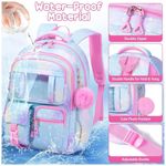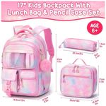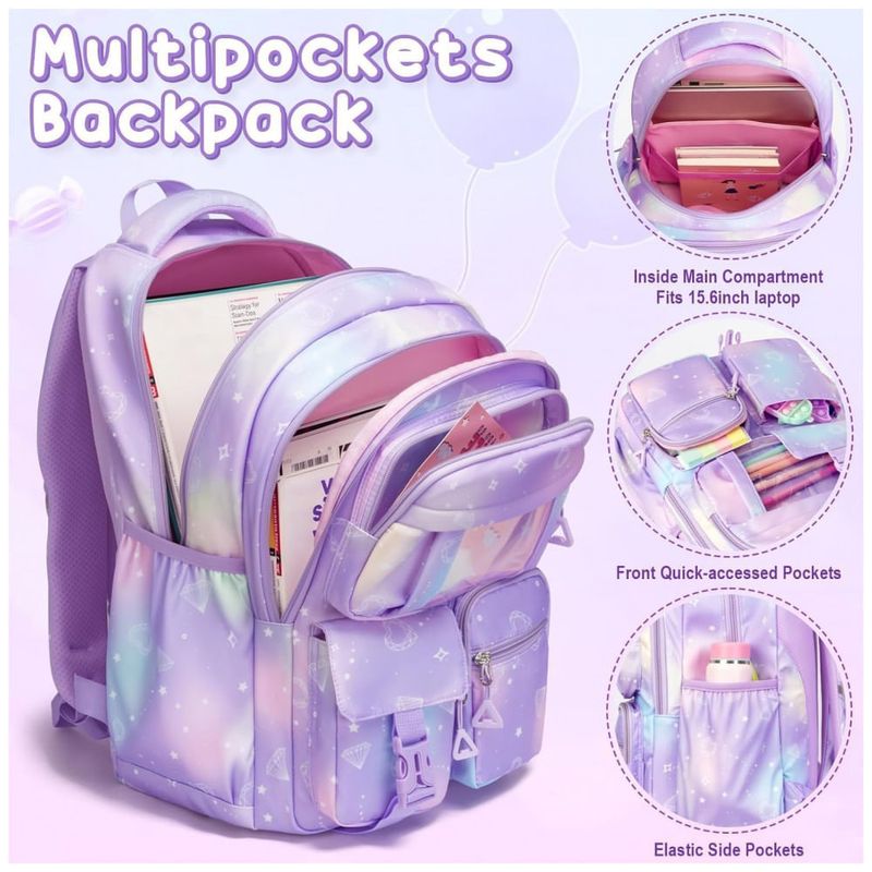 Conjunto escolar 3 em 1 composto por mochila, lancheira térmica e estojo, indicado para meninas a partir de 6 anos em fase de ensino fundamental e médio. A mochila mede aproximadamente 43 cm de altura, 30 cm de largura e 17 cm de profundidade, com compartimento principal capaz de acomodar notebook de até 15,6", livros, cadernos, revistas e pastas em formato A4, além de três bolsos frontais externos para acesso rápido e um bolso transparente para visualização imediata de itens como cartões, bilhetes e pequenos objetos.