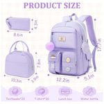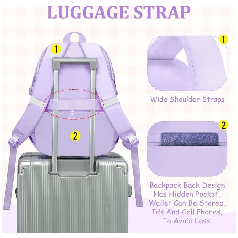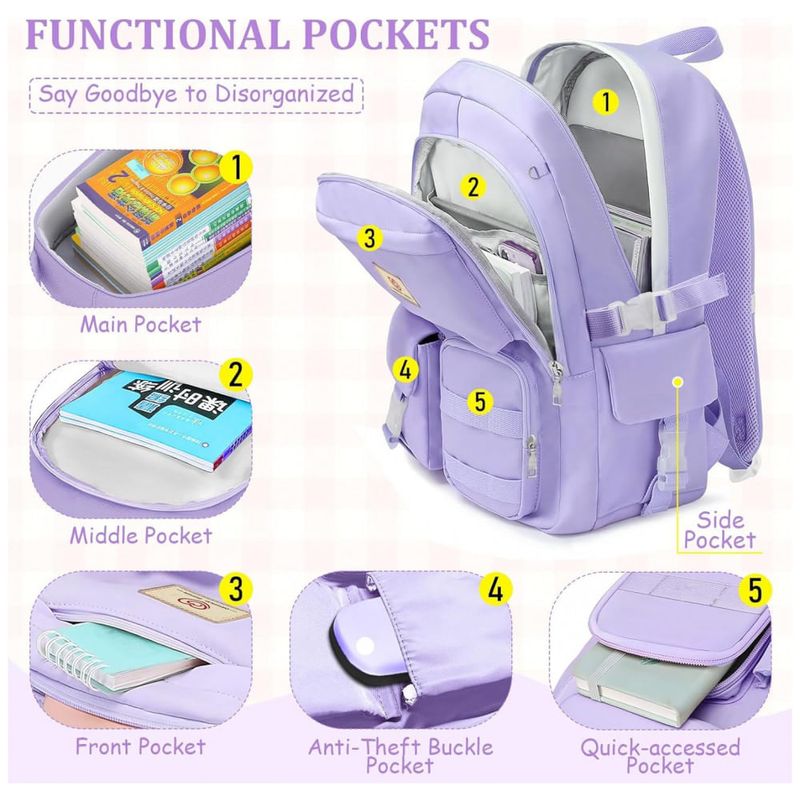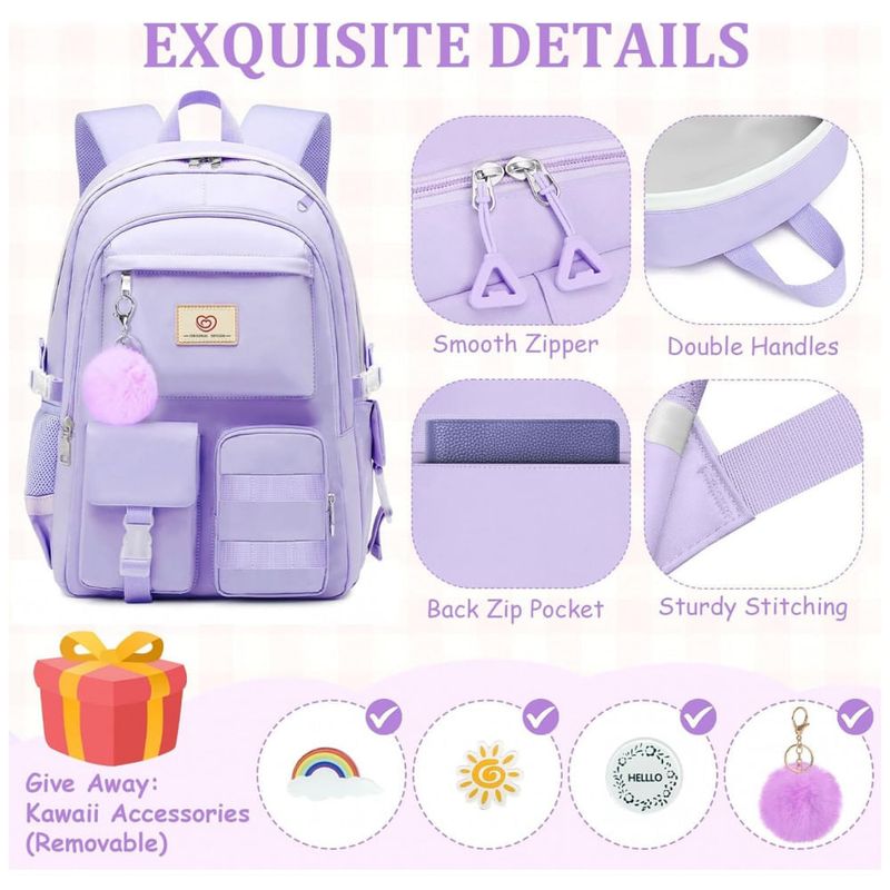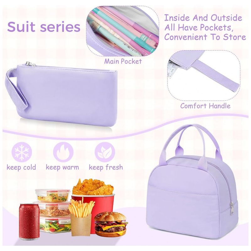 Mochila escolar Fitvc em conjunto de 6 peças, indicada para meninas, adolescentes e jovens em rotina escolar, viagens e uso diário. O design com múltiplos compartimentos acomoda livros, cadernos, materiais de escrita, garrafas e itens pessoais, enquanto lancheira térmica, estojo, bolsa de moeda removível, chaveiro com pompom e pins decorativos completam o kit de organização.
